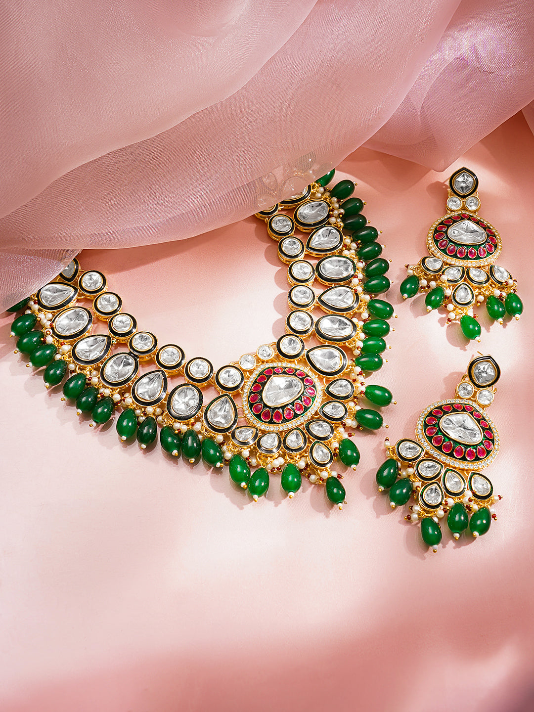 Rubans 22K Gold Plated Brass Kundan Green Beads Bridal Jewellery Set