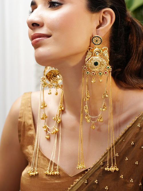 These Rubans 22K gold-plated long statement dangler earrings feature cascading chains with green and red stones, with golden beads blending modern artistry with luxurious festive elegance.