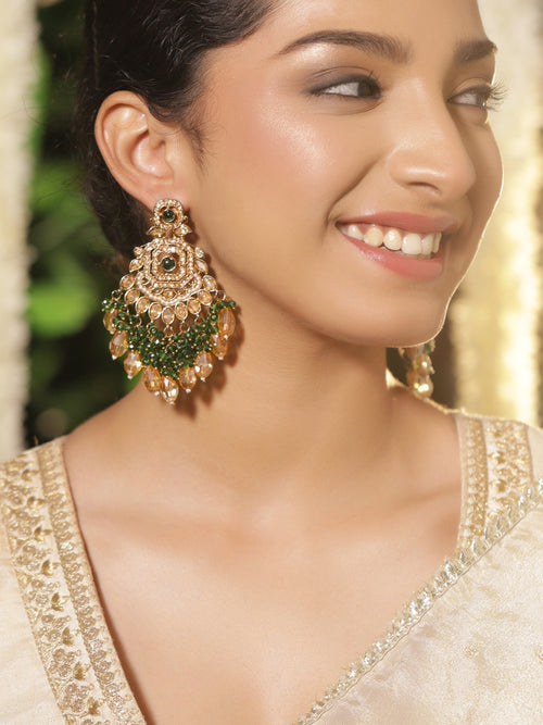 Earrings : Rubans 22K Gold-Plated Chandelier Earrings studded with Kundan & Cubic Zirconia, adorned with emerald green beads and crystal danglers, perfect for weddings, festive occasions & party looks.