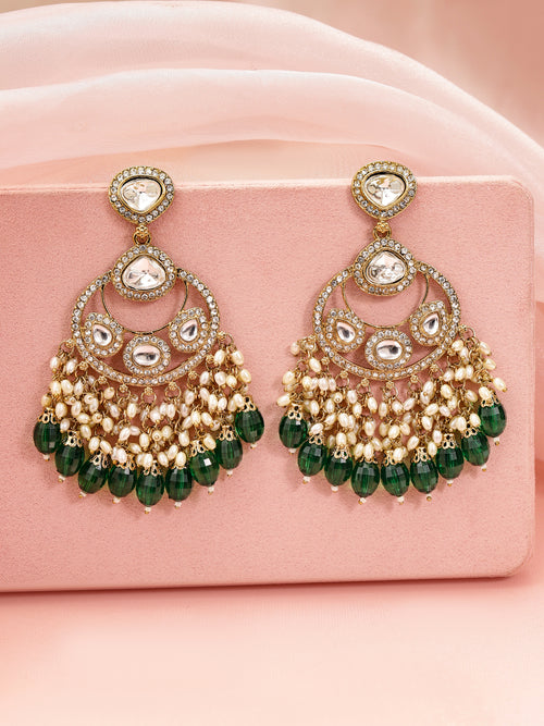 Enhance your ethnic look with these 18K gold-plated chandbali earrings, intricately studded with Kundan, sparkling Zirconia, pearls, and emerald green bead danglers.