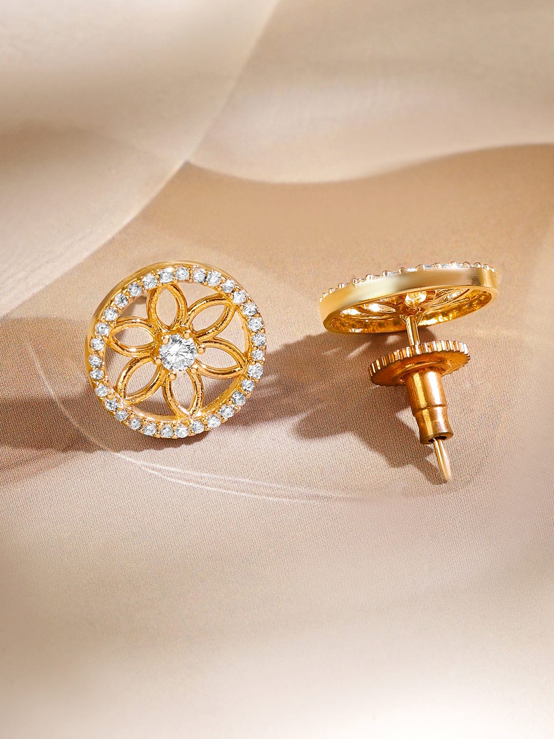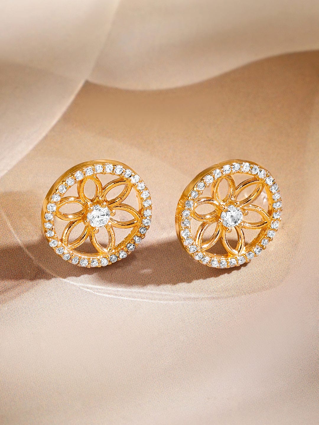 Mangalsutra Set : This 18K Gold-Plated mangalsutra set features a floral pendant studded with white cubic zirconia, a black beaded chain, and matching earrings. Perfect for traditional charm and everyday elegance.