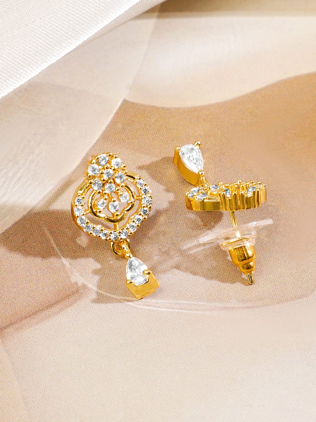 Mangalsutra Set : This 18K Gold-Plated mangalsutra set features a curved bar-style pendant studded with white cubic zirconia, teardrop dangler, black beaded chain, and matching earrings — a perfect blend of elegance and tradition.