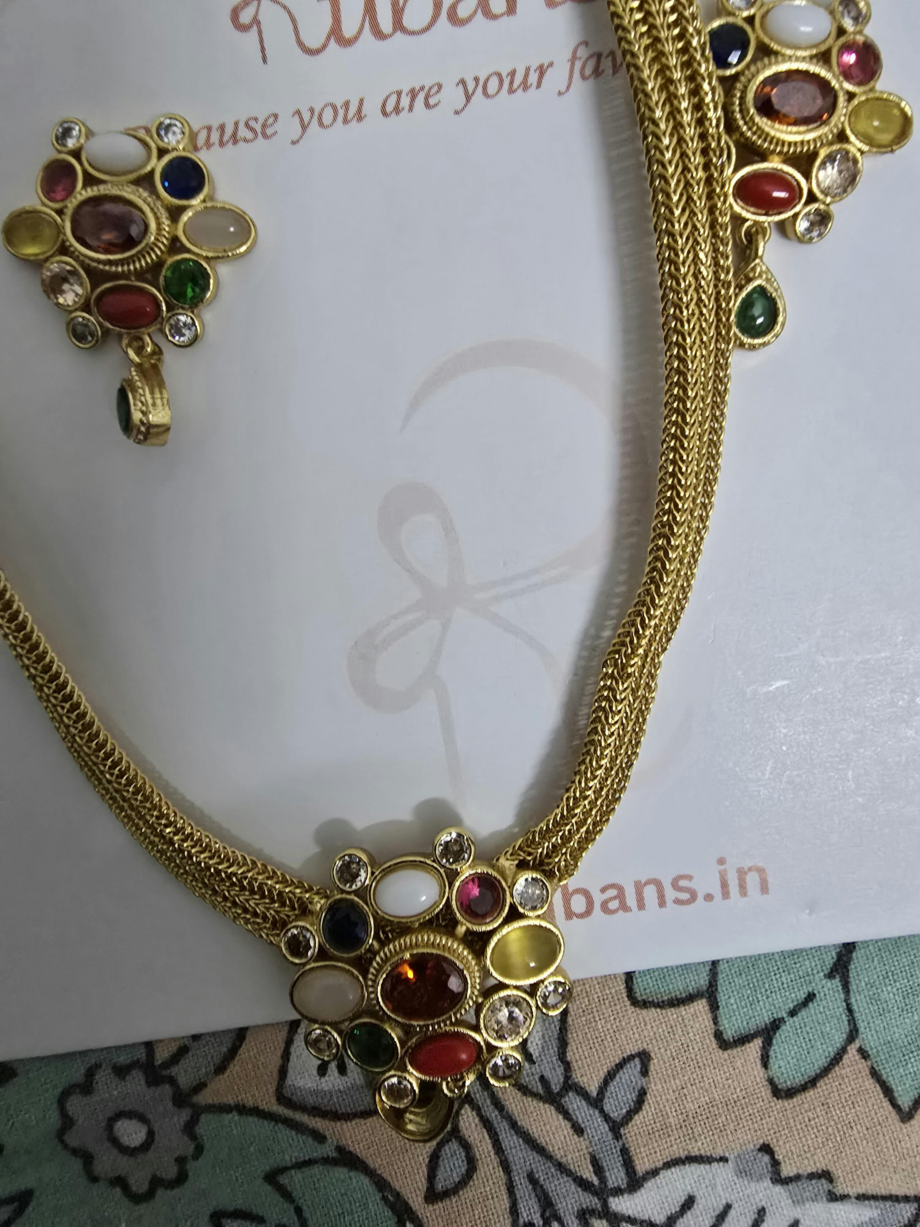 Jewellery Set : This 22K gold-plated necklace set is adorned with vibrant multicolor gemstones, featuring a statement floral-inspired design. Paired with matching earrings, it is perfect for festive & traditional occasions.