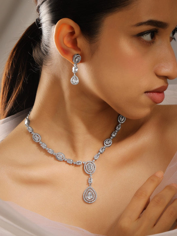 Jewellery Set : A rhodium-plated luxe statement jewellery set, adorned with blue sapphire stones and AAA cubic zirconia in a silver-tone finish. Ideal for weddings, grand celebrations & special occasions.