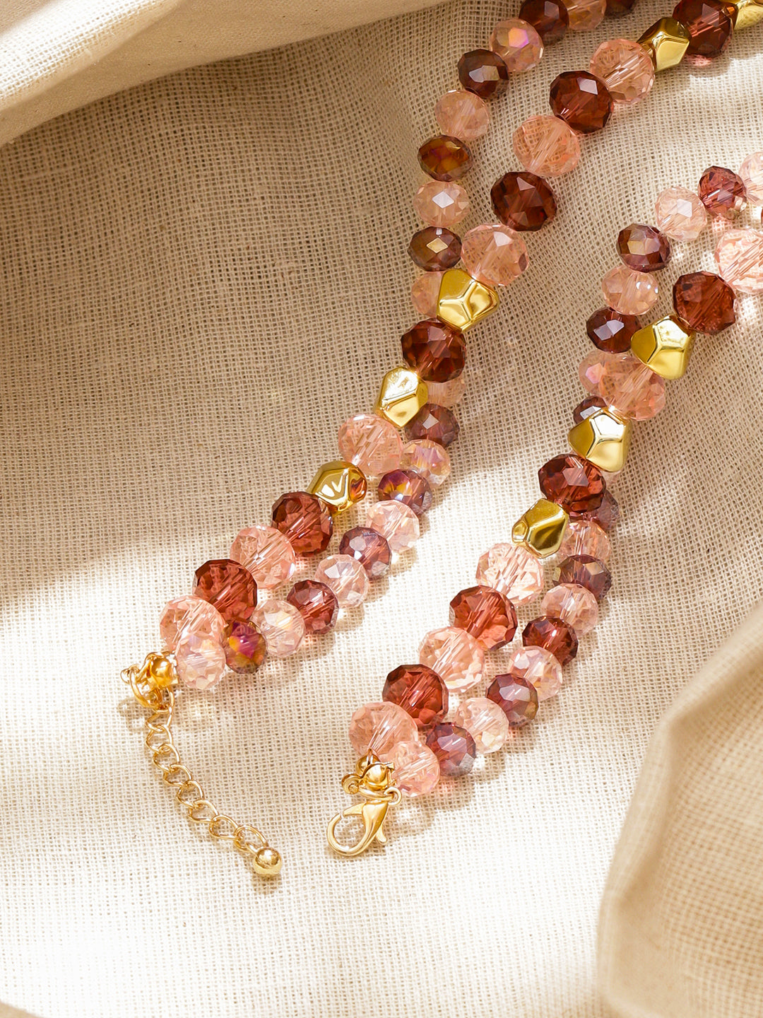 Necklace : This Rubans 18K gold-plated necklace showcases multi-layered amber, pink, and golden crystal beads — a radiant statement piece that blends modern chic with festive elegance.