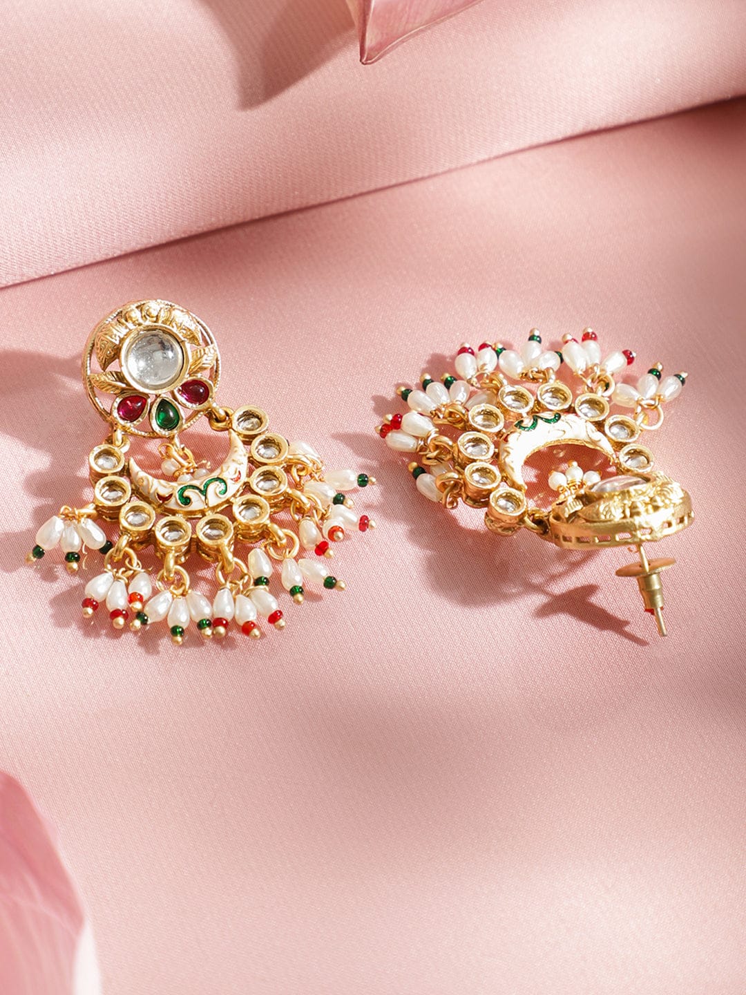 Jewellery Set : Rubans 22K Gold-Plated handcrafted choker set with white kundan, ruby red & emerald green stones, and pearl beads. A statement design perfect for weddings, festive occasions & party looks.