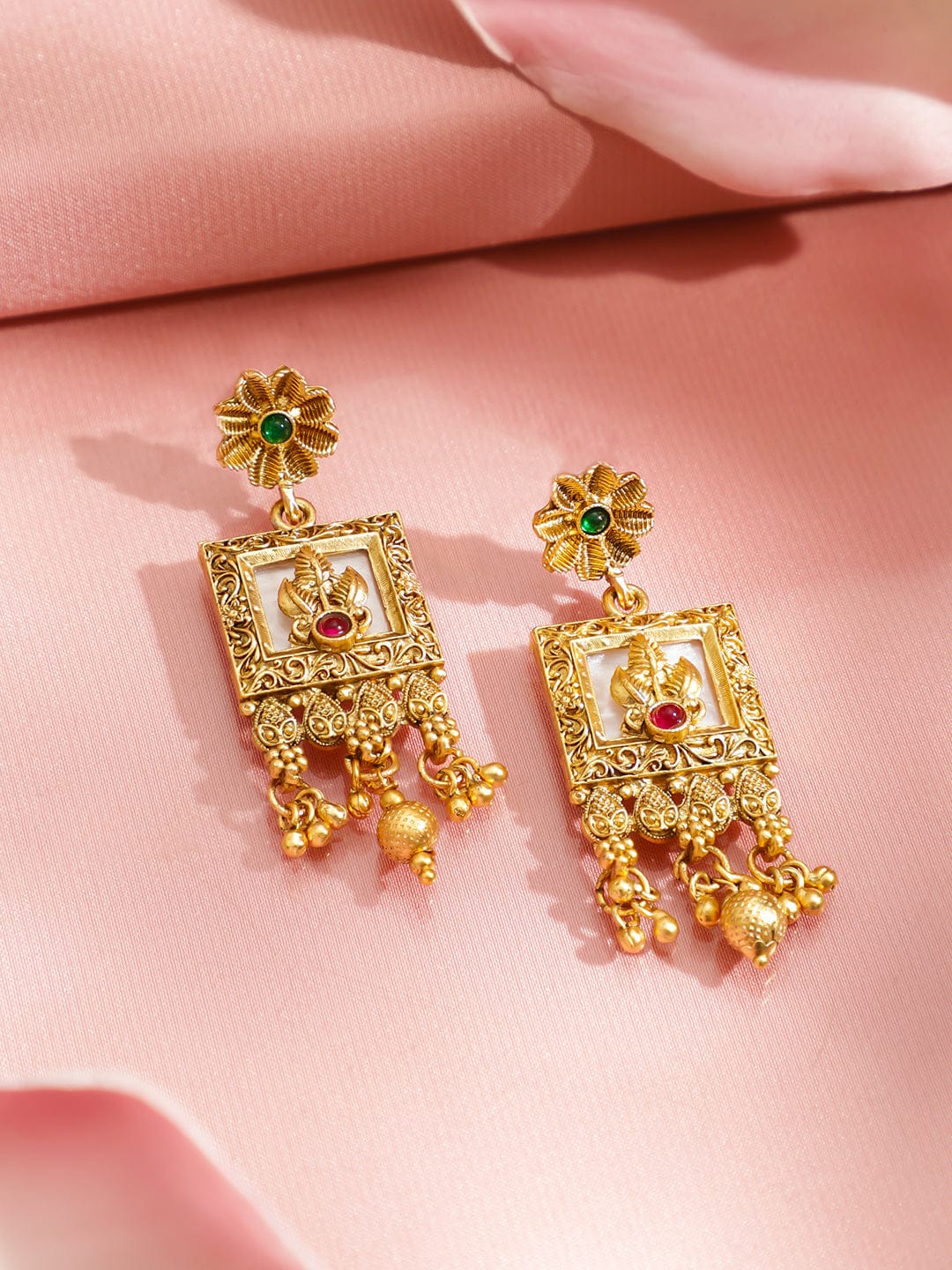 Jewellery Set : Rubans 22K Gold-Plated necklace set with ruby red & green stones, golden beads and pearls in a multi-strand design, perfect for weddings, festive occasions and grand ethnic celebrations.