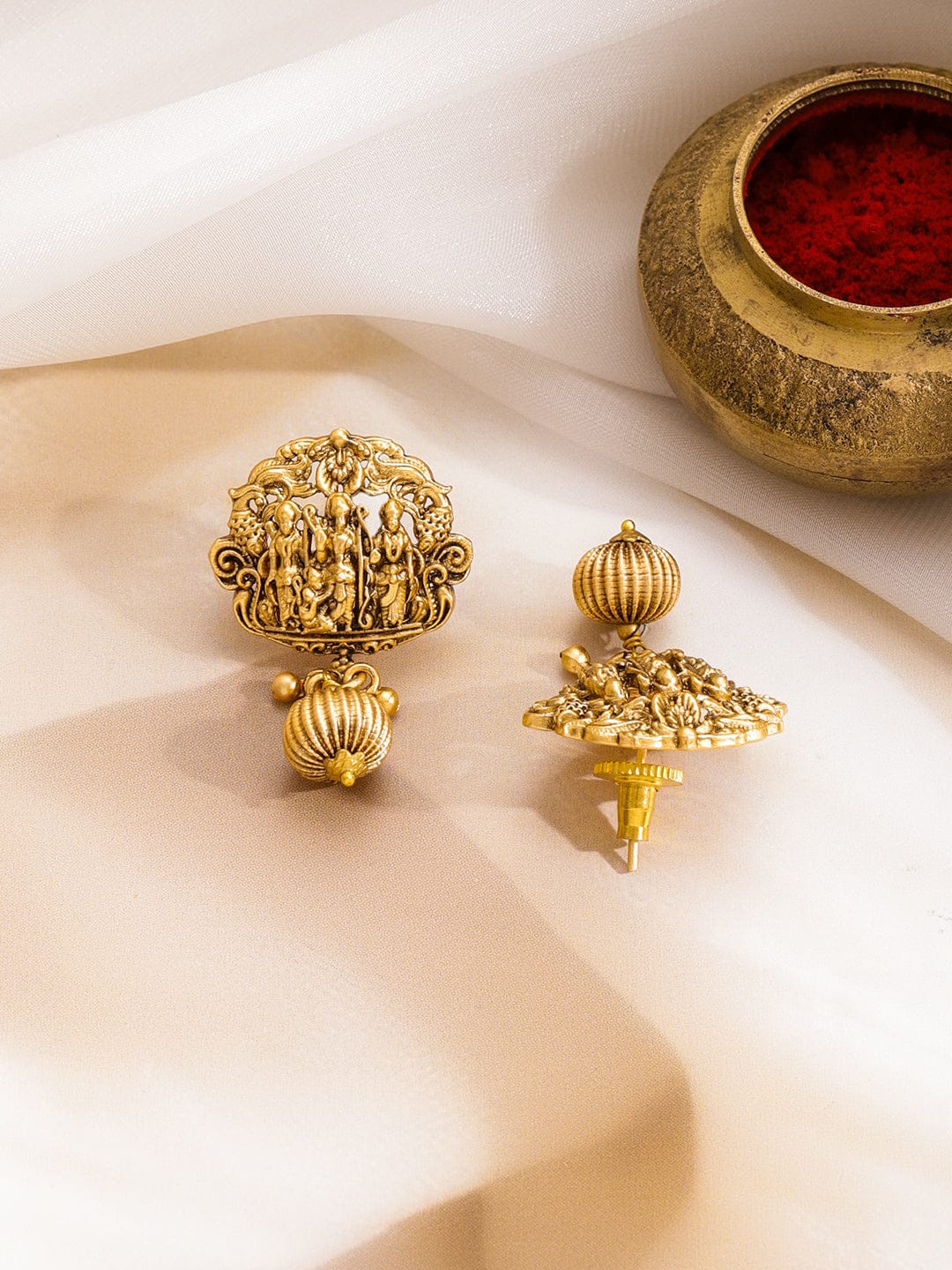 Jewellery Set : Rubans 22K Gold-Plated Ruby Studded Temple Design Necklace Set with Intricate God & Peacock Motifs, Beaded Chain & Matching Earrings for Women & Girls | Wedding & Festive Jewellery.