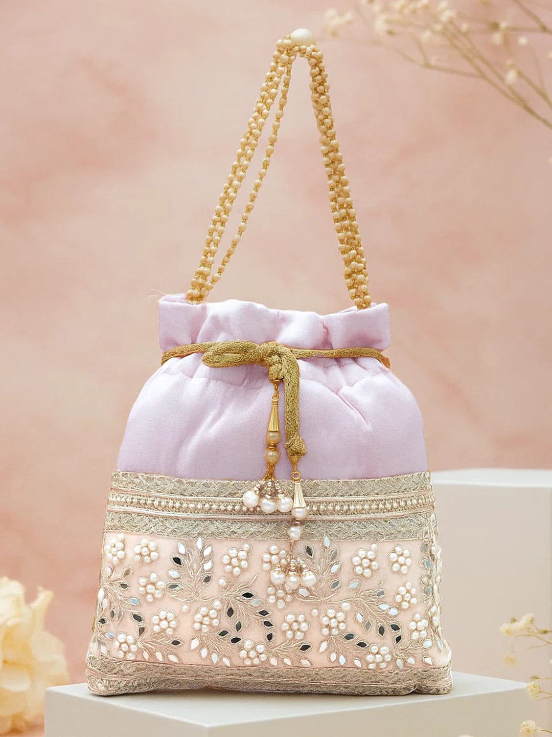Rubans Pastel Pink Potli Bag with Golden Zari, Mirror & Floral Embroidery & Beaded Handle Handbag, Wallet Accessories & Clutche