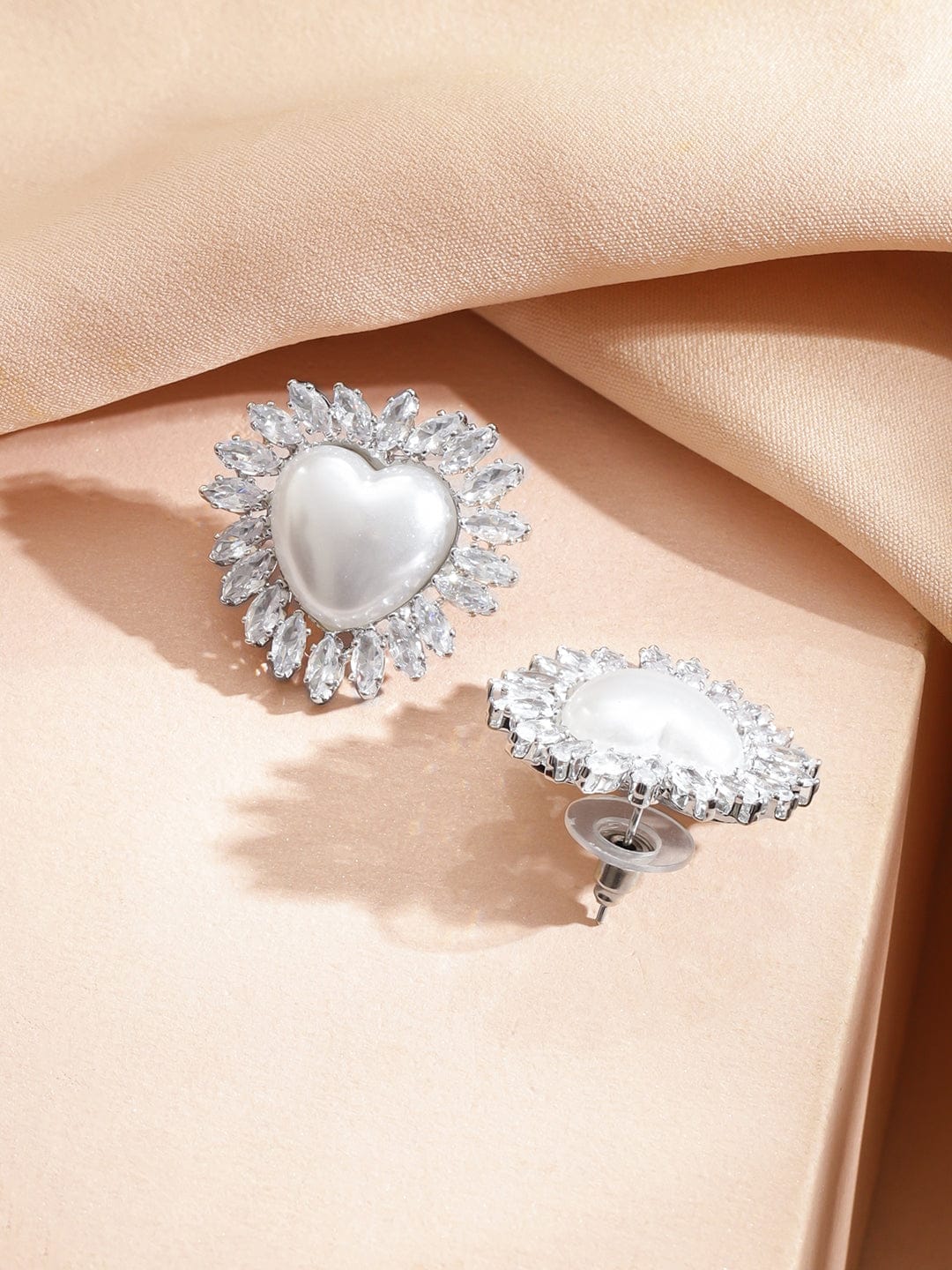 Necklace Set : Rubans Voguish rhodium-plated necklace set with heart-shaped pearl pendant, crystal white cubic zirconia detailing, and matching earrings. Perfect for weddings, festive occasions, and parties.