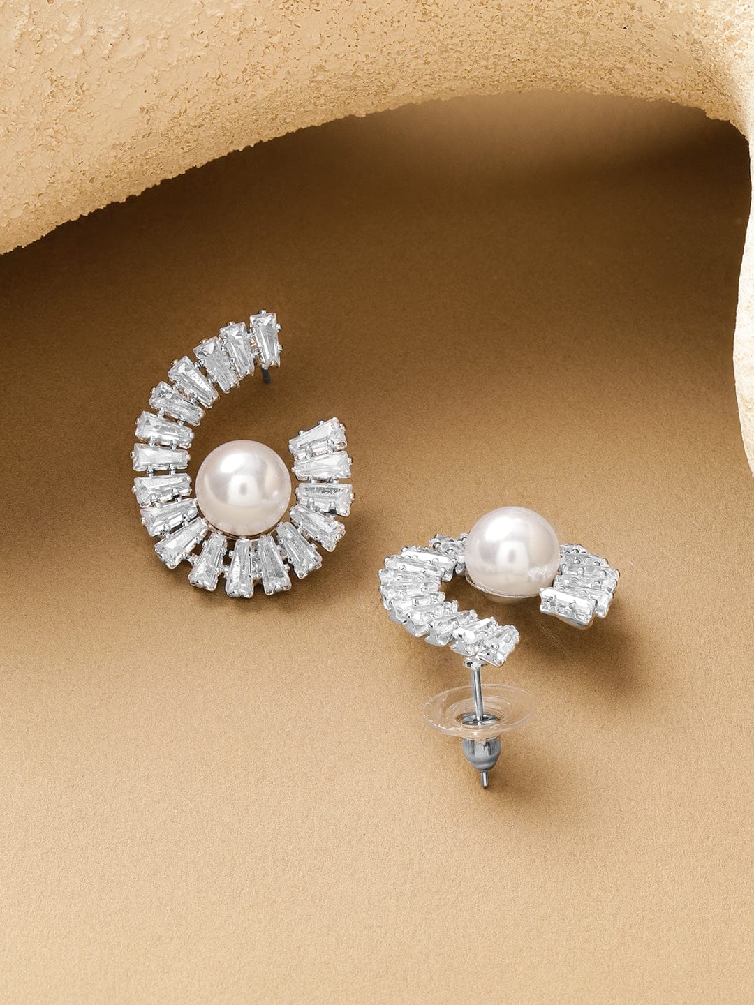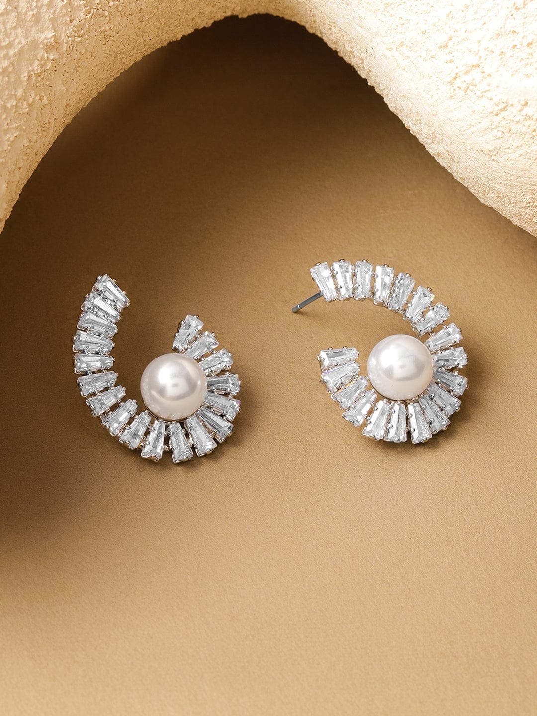 Earrings : Add a swirl of sophistication with Rubans Voguish rhodium plated stud earrings, featuring spiral crystal AD detailing and white pearl drops for effortless festive and evening elegance.