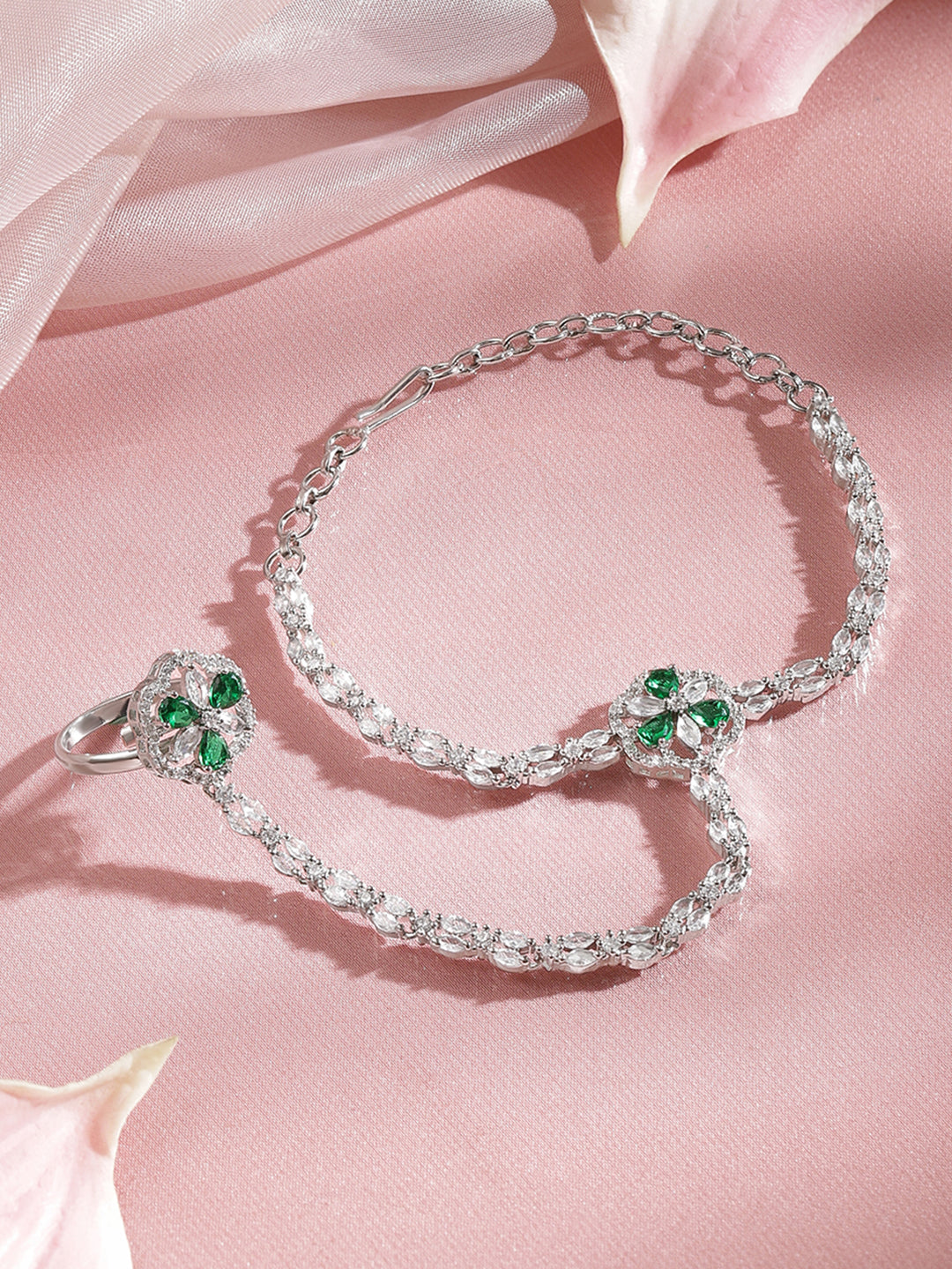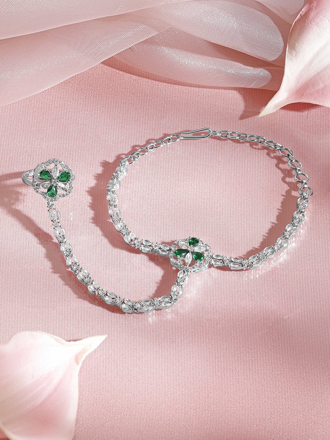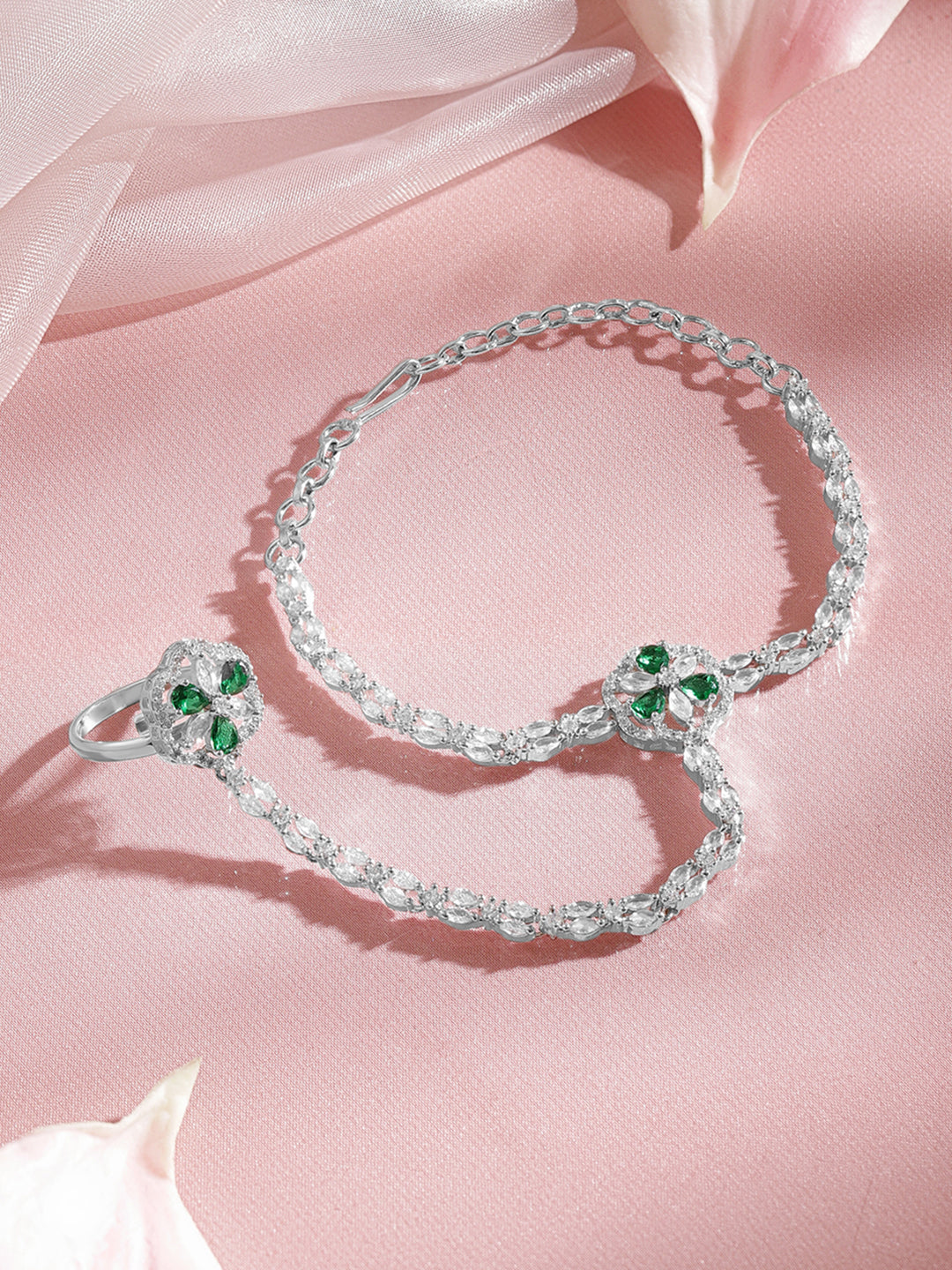 Rubans Hand Harness Bracelet with Ring for Women Rhodium Plated CZ and Emerald Green Bridal Wedding Party Jewellery for Women & Girls