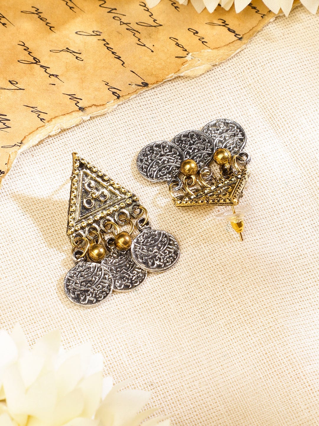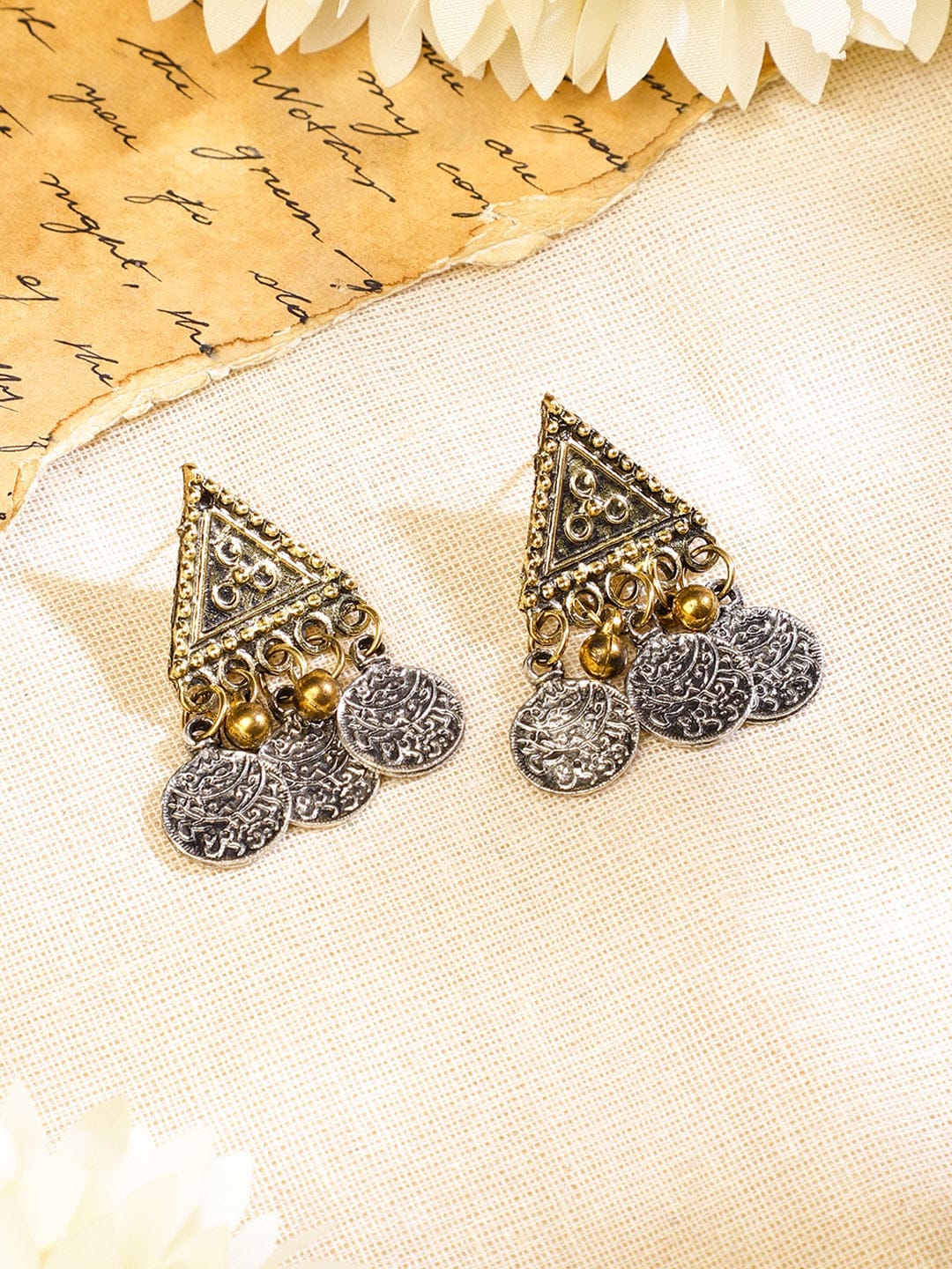 This oxidized dual-plated necklace set features multilayered strands with antique silver and gold coin detailing, paired with matching triangular earrings. Designed for women, perfect for festive, cultural, and ethnic occasions.