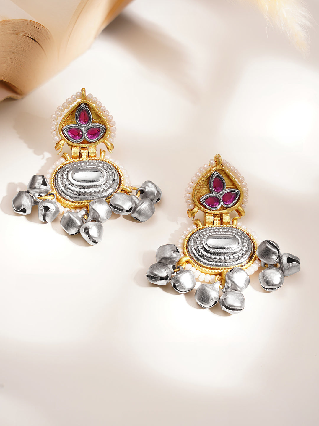 Crafted in oxidised silver and gold tone brass with ruby pink accents white pearl detailing and ghungroo hangings these traditional drop earrings add festive charm to ethnic looks