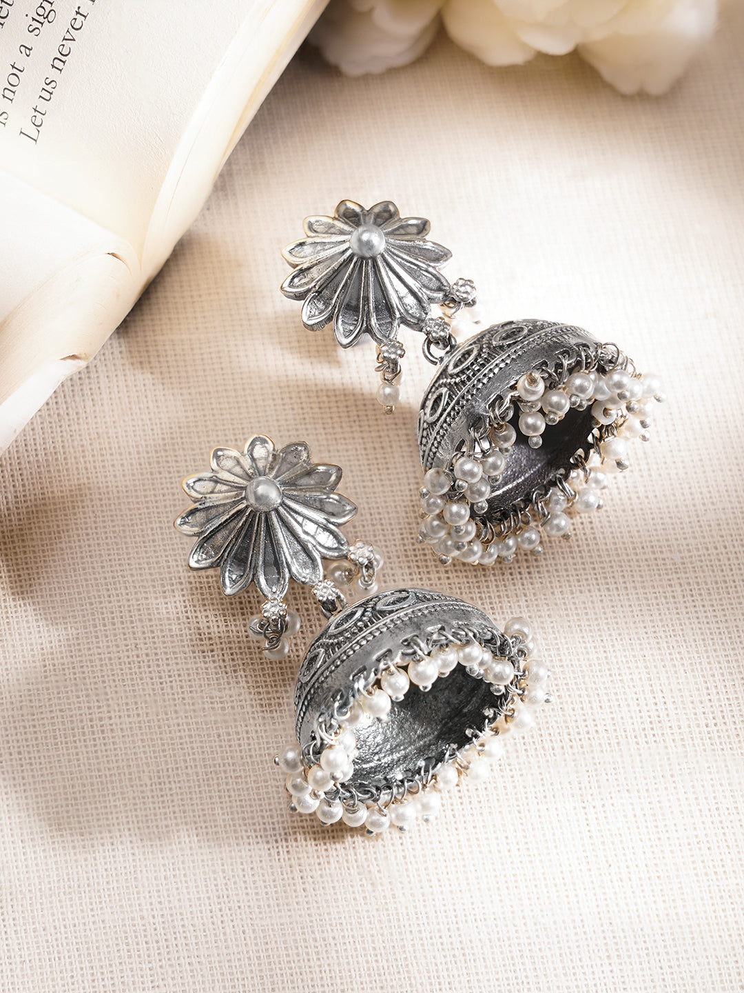 Share on WhatsappOxidised Brass Floral Jhumka Earrings with White Pearl Hangings