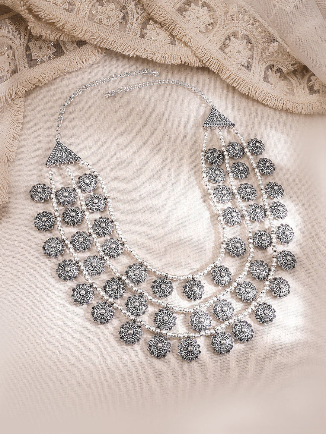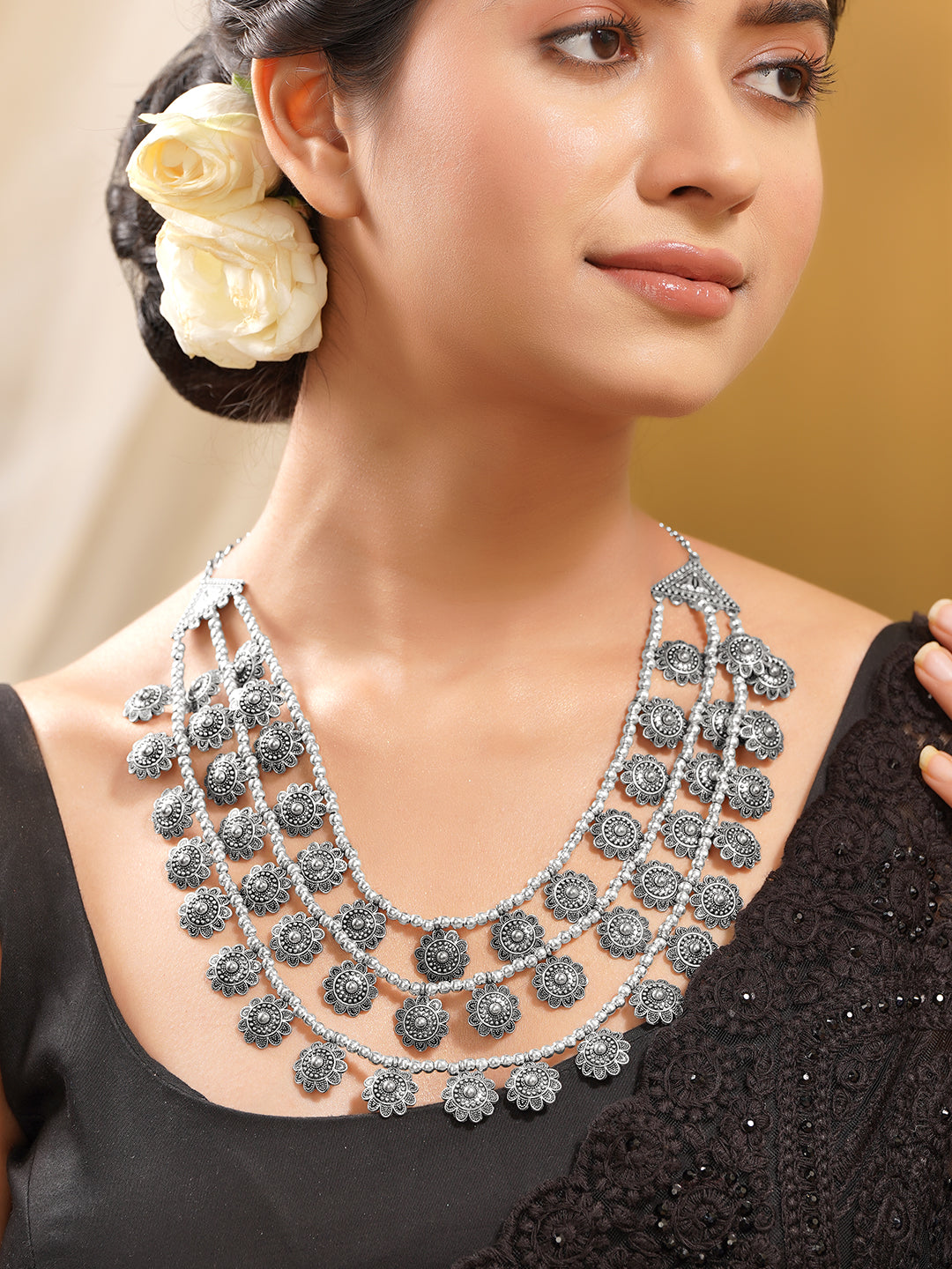 This oxidised silver long necklace features multiple layered bead strands adorned with intricate floral coin motifs. A bold statement jewellery piece perfect for festive occasions ethnic wear and fusion styling.