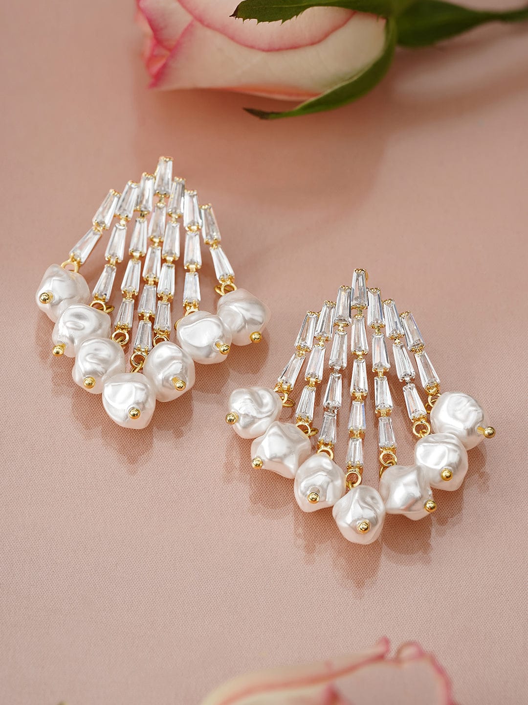 Earrings : These 22K gold-plated earrings feature cascading baguette-cut cubic zirconia and baroque pearls in a fan-inspired design—perfect for weddings, parties, and elegant gifting for women & girls.