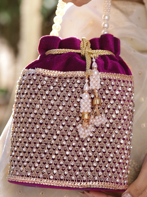 Potli Bag : A luxe purple velvet potli hand-embellished with shimmering golden work, finished with a lustrous multi-strand pearl handle and pearl tassel drawstrings—perfect to elevate wedding, festive and party looks.