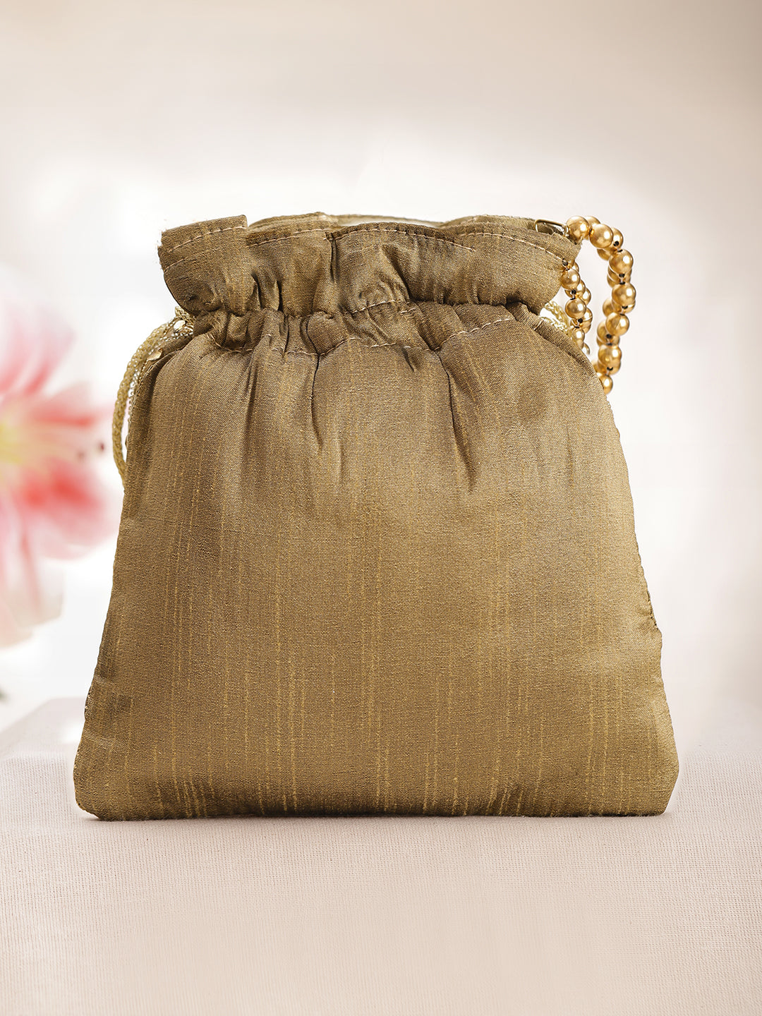 Crafted in olive green fabric with gold sequin embroidery zari thread detailing and beaded accents this elegant potli bag adds rich festive charm to wedding and traditional outfits