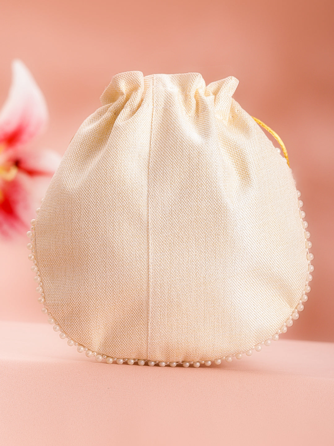 Crafted in off white fabric with a green patch design gold thread work and pearl detailing this elegant potli bag adds festive charm and traditional beauty to ethnic outfits