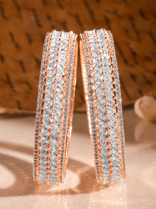 Rubans Set of 2 22K Rose Gold-Plated White Cubic Zirconia Studded Leaf Motif Handcrafted Premium Bangles