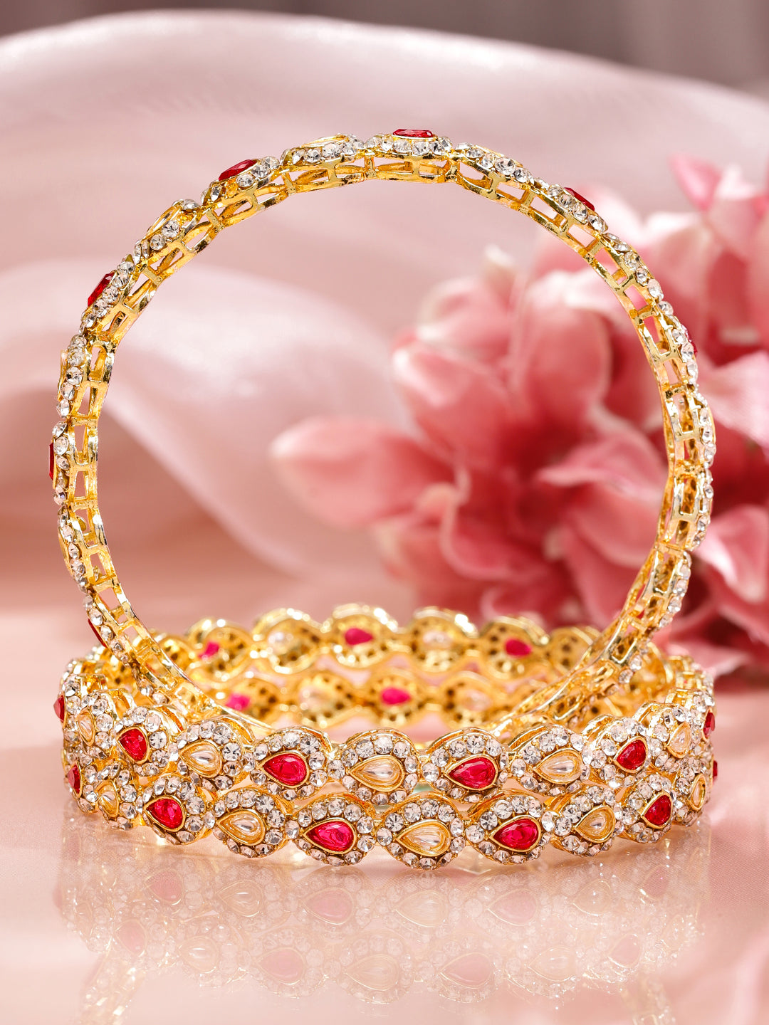 Bangle : Set of 4 18K mehandi gold-plated bangles studded with ruby pink gemstones, white kundan and sparkling zirconia. Crafted for bridal elegance, festive looks and ethnic celebrations.
