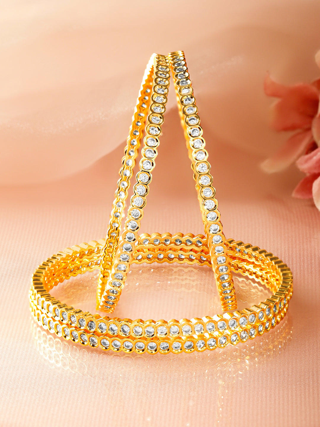 - Set of 4 Designer Bangles: Elegant geometric cutwork design with precision Cubic Zirconia embellishments for a luxe finish.
