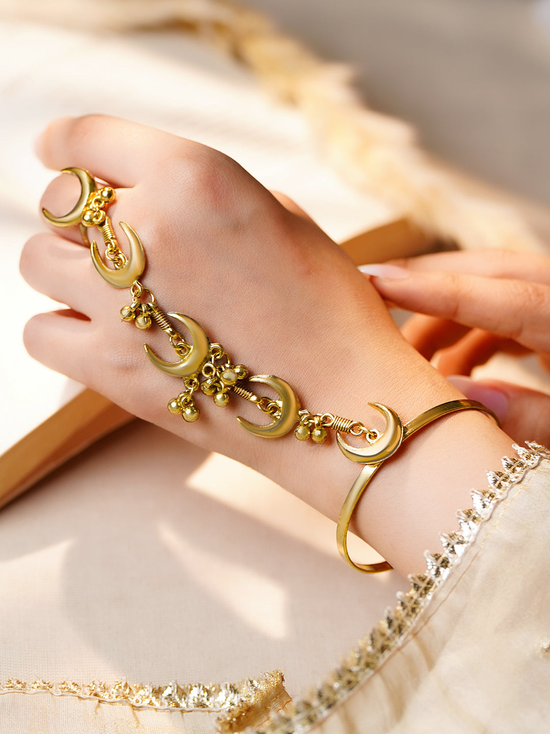 Gold Crescent Moon Haathphool Bracelet