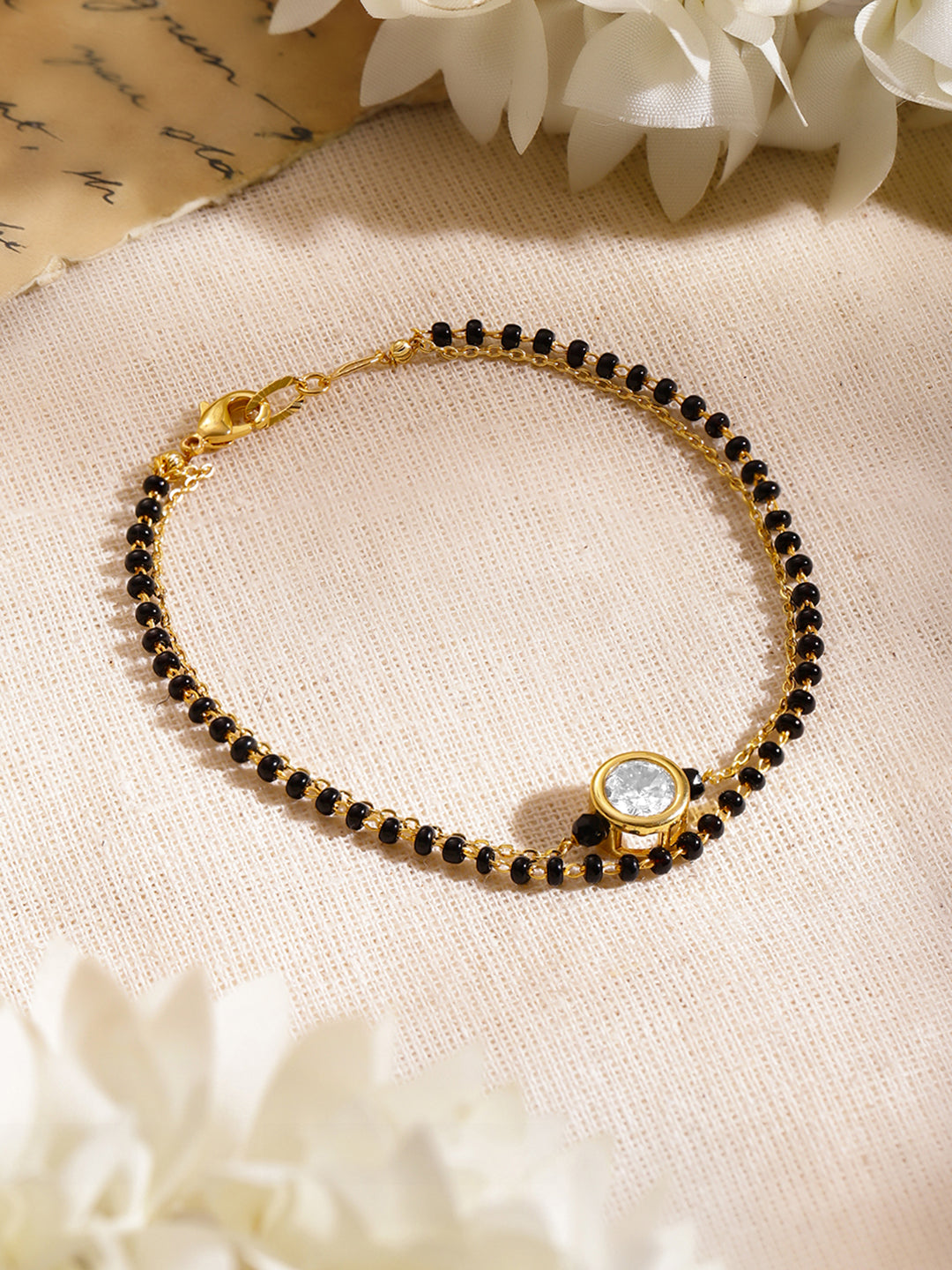 Crafted in 18K Gold plated Brass, this elegant mangalsutra bracelet features a layered black beads design highlighted with a luminous white Cubic Zirconia centre, offering refined luxury with everyday grace.