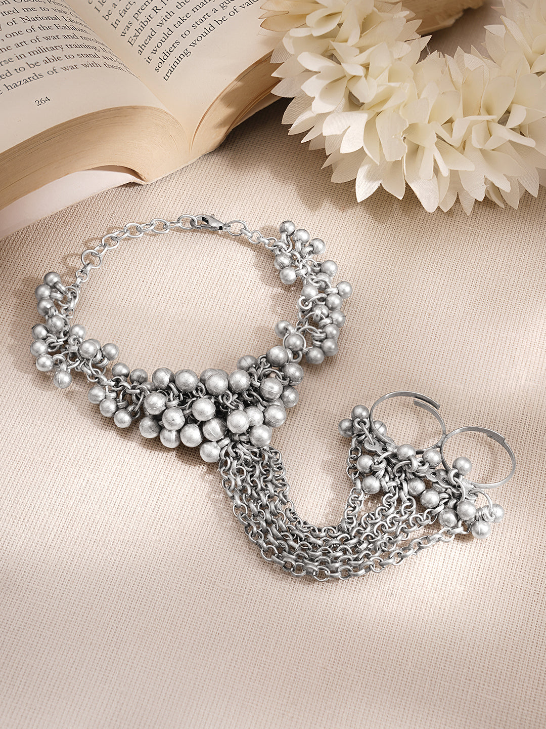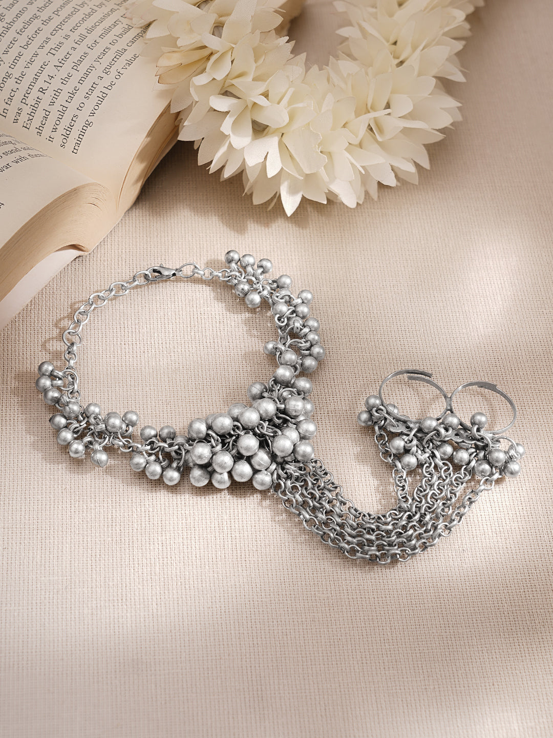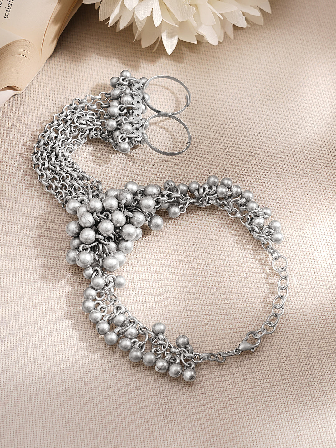 Make a bold ethnic statement with this Rubans oxidised silver tone hand harness bracelet featuring layered chain drapes connected to a ring with ghungroo bead cluster detailing. The intricate traditional design creates dramatic hand jewellery styling, perfect for festive occasions, wedding celebrations and cultural outfits, making it a distinctive gifting jewellery choice for women and girls.