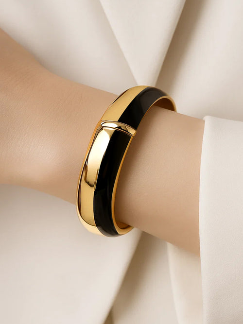 - Dual-Tone Elegance: Bold bangle crafted in glossy black enamel with 22K gold-plated accents.