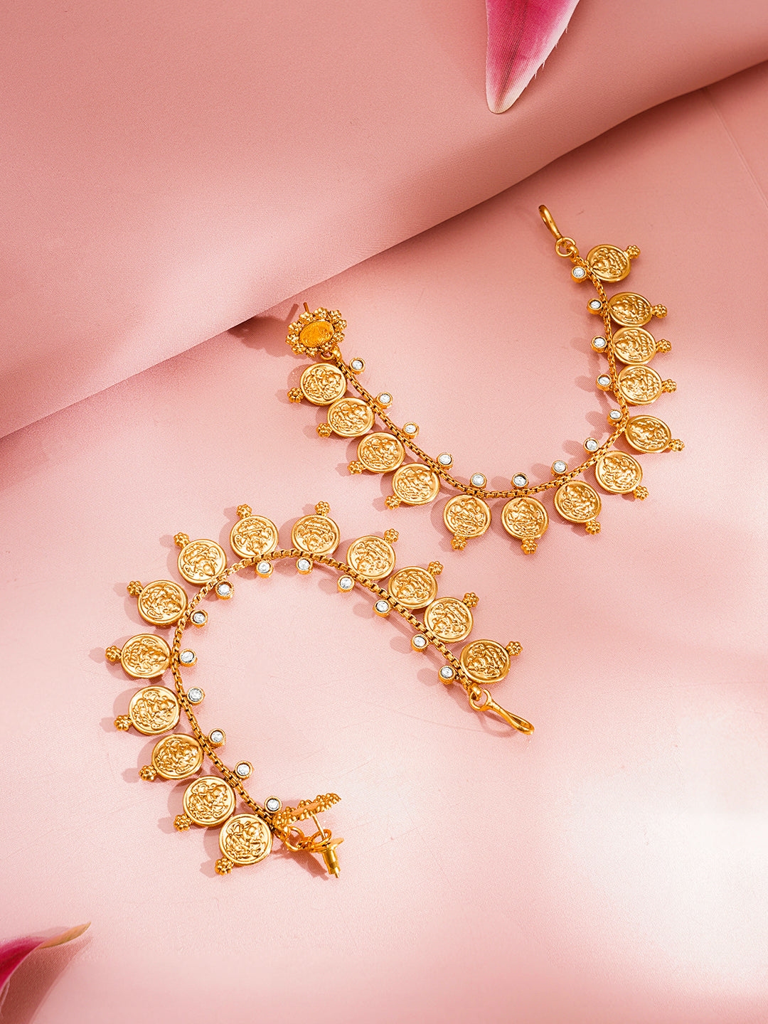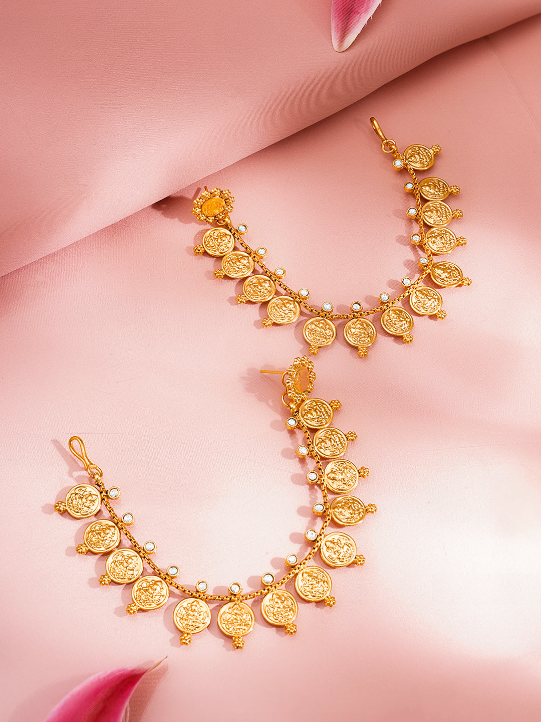 Crafted in 18K gold plated brass this temple inspired kaan chain earring set features intricate coin motifs with refined detailing perfect for weddings festive rituals and bridal looks