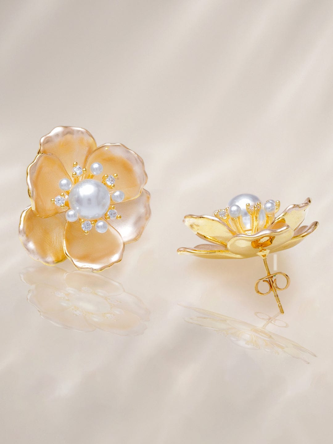 Earrings : Rubans 18K gold-plated brass floral stud earrings with golden beige enamel petals, white pearls & crystal white cubic zirconia for a refined, elegant look perfect for daily wear, festive & party occasions.