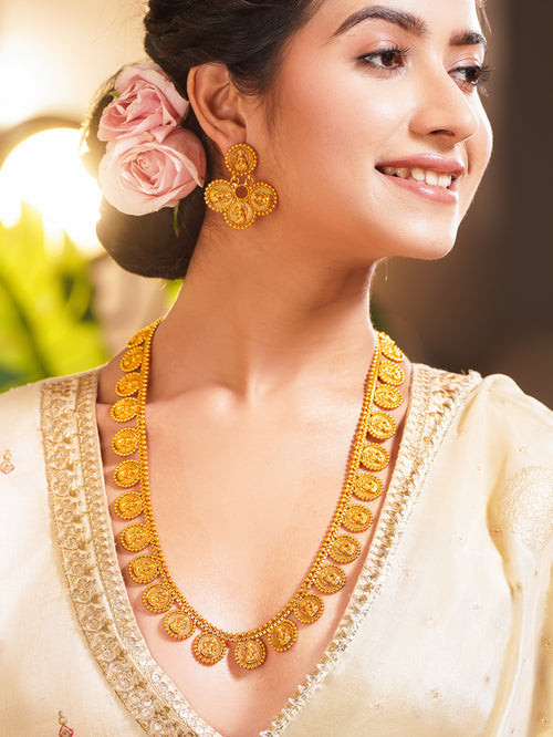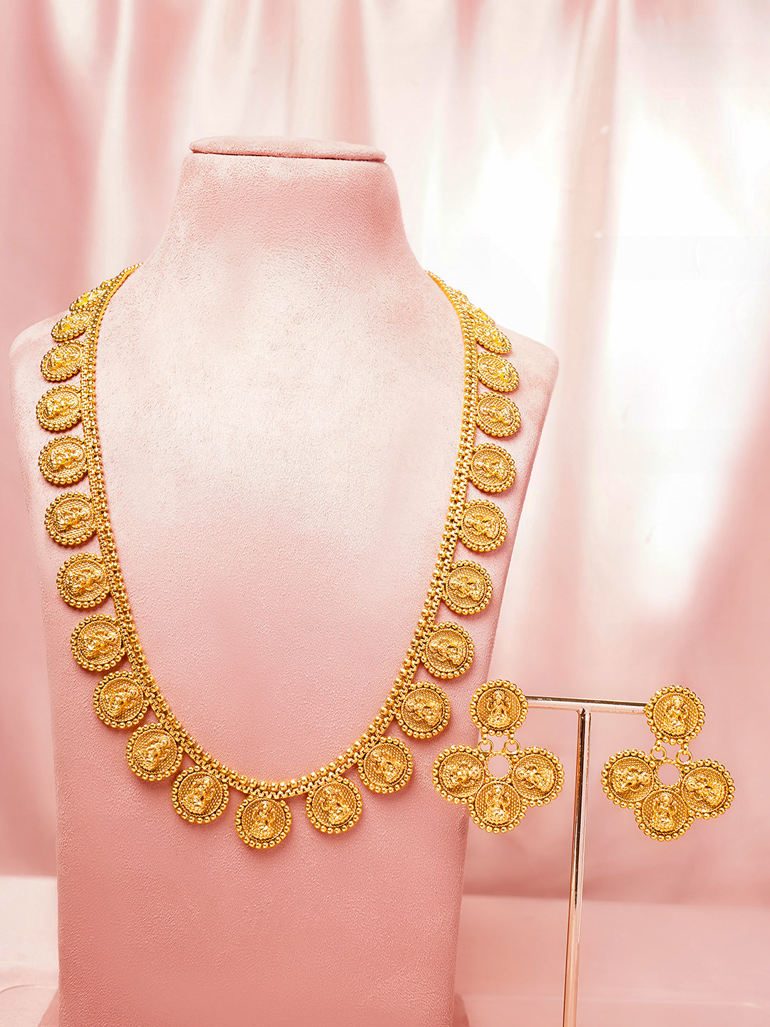 Gold Plated Brass Gold Temple Coin Long Necklace Set