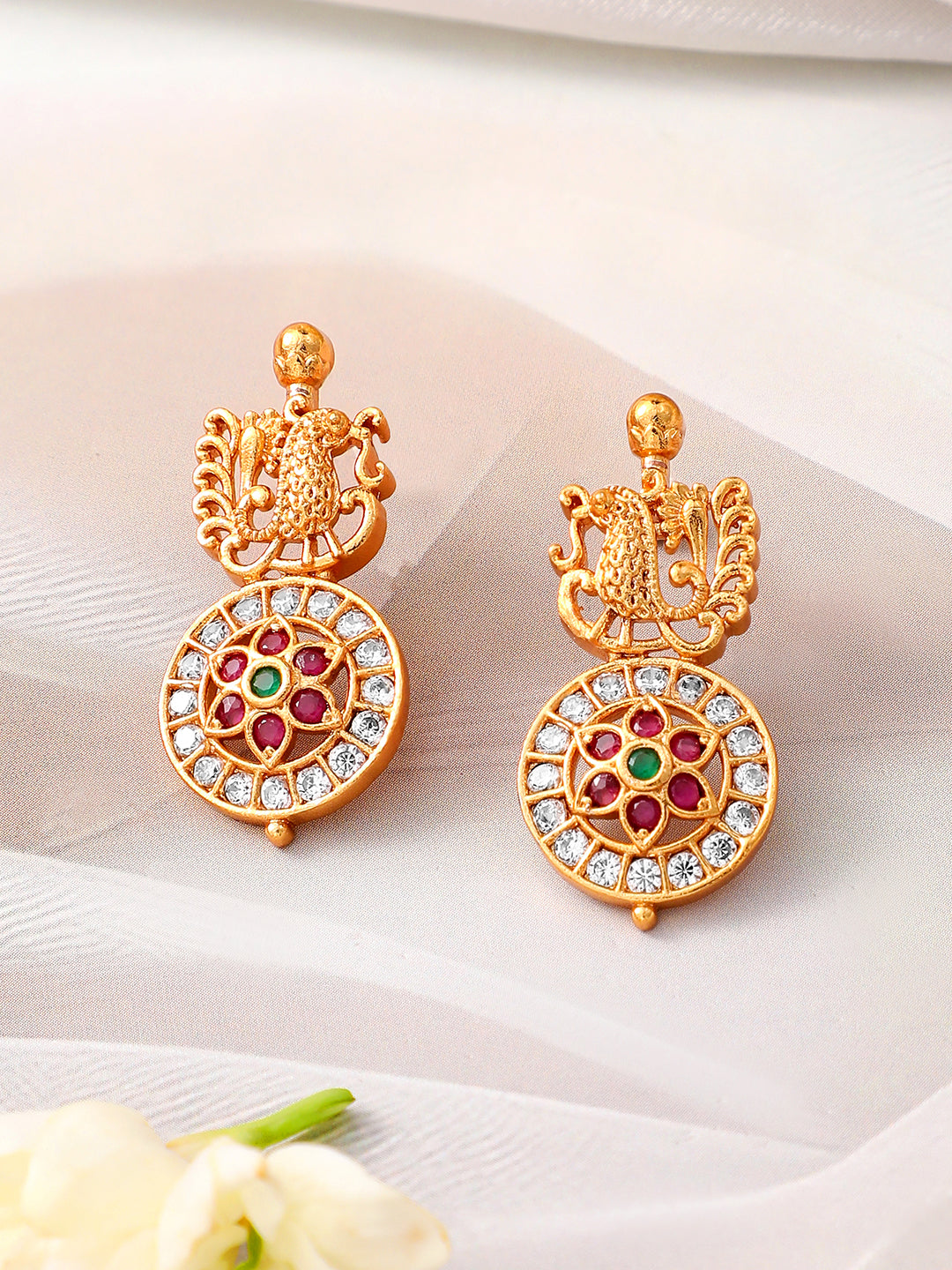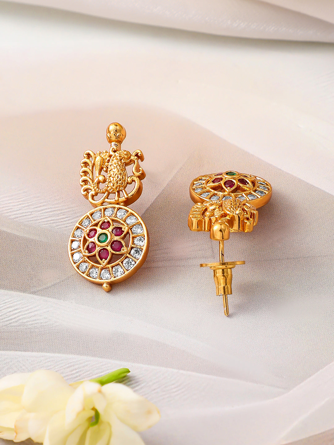 This exquisite 22K gold-plated temple necklace set features intricate motifs, ruby red, emerald green and cubic zirconia accents, and a flawless traditional design. Perfect for brides and festive occasions.