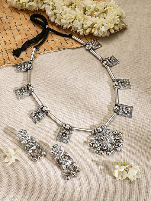 Jewellery Set : Rubans' oxidised silver-plated necklace set features geometric square motifs with intricate detailing & silver beads, offering a bold and traditional look perfect for enhancing ethnic outfits.