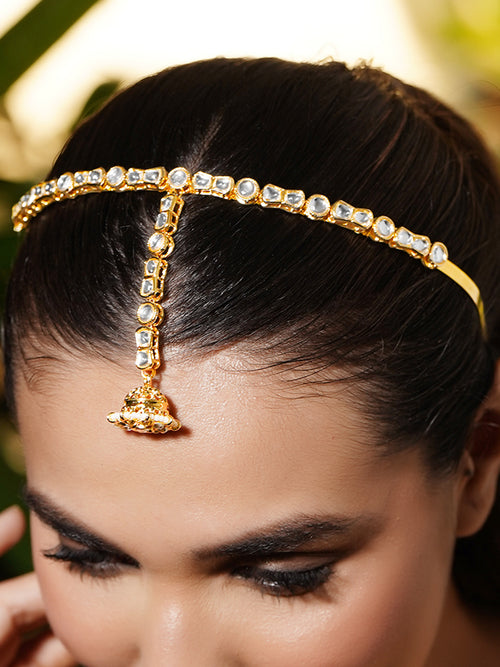 A premium 18K gold-plated brass maangtikka hairband designed with straight-line Kundan stones and a pearl-edged floral pendant, crafted for elegant festive and wedding looks.