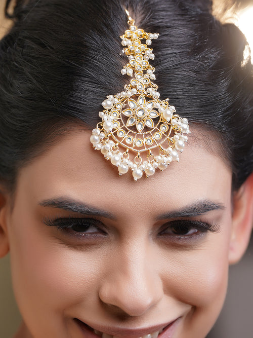 Rubans 18K Gold Plated Bridal Maangtikka with White Kundan Stones and Pearl Detailing Traditional Wedding & Festive Hair Jewellery for Women & Girls