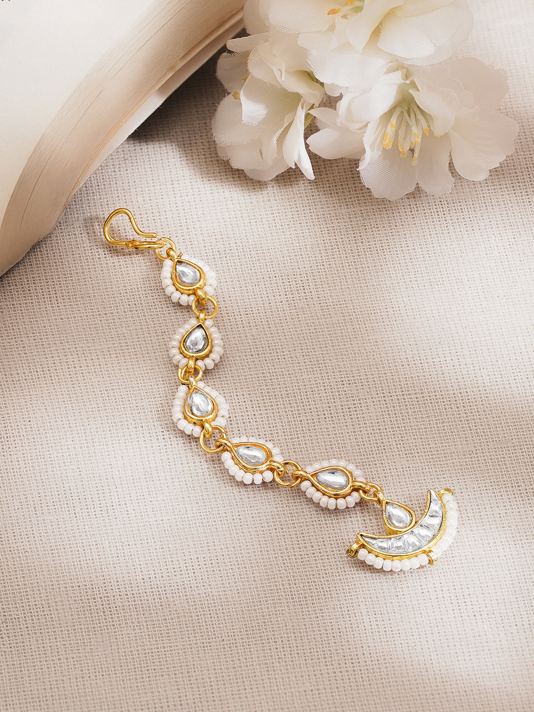 This gold plated maangtikka features elegant teardrop Kundan detailing framed with delicate white pearl beads and a crescent motif pendant. A refined bridal jewellery piece perfect for weddings festive occasions and traditional looks.