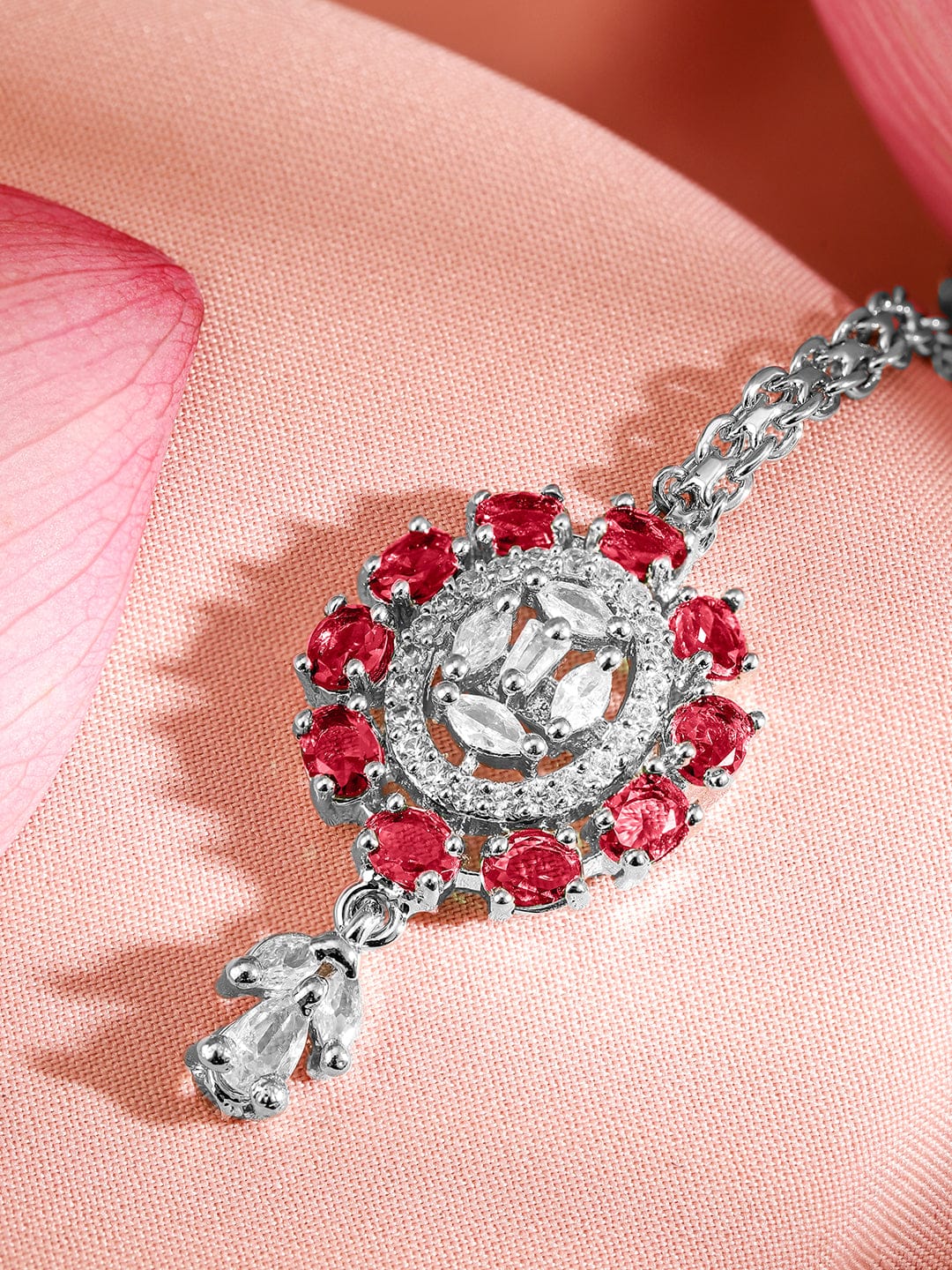 Share on WhatsappAmerican Diamond Zirconia Pink Accented Maang Tikka
