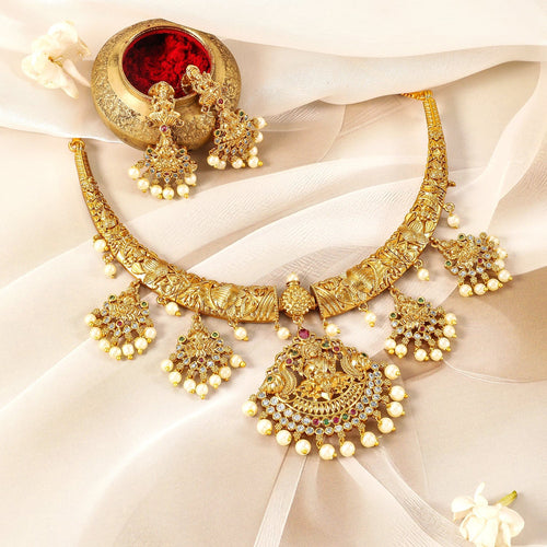 Celebrate the divine with this exquisite Rubans 22K gold-plated temple necklace set, featuring an intricate Laxmi motif. This luxurious set is adorned with rich Ruby, Emerald, and CZ stones, complemented by lustrous pearl beads that add a touch of elegance. The set includes a beautifully crafted necklace and matching earrings, perfect for embracing traditional aesthetics. A perfect choice for weddings and festive occasions, this divine Laxmi temple necklace set showcases the timeless allure of temple jewellery, blending cultural heritage with contemporary style.