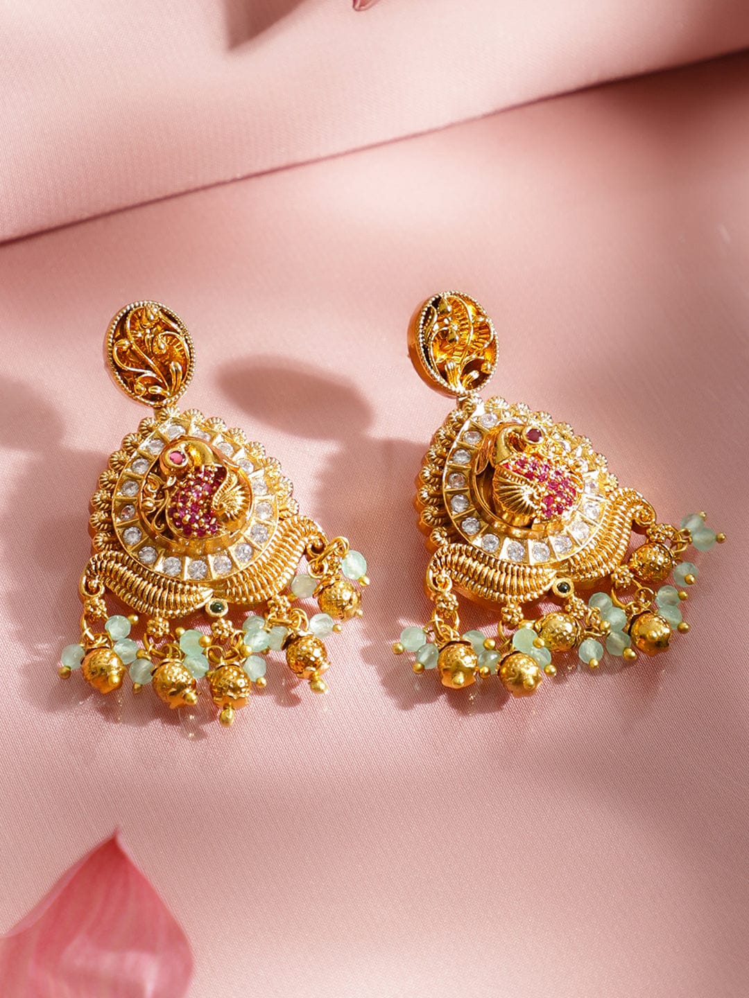 Rubans 22K Gold-Plated Bird Motif Statement Necklace Set with Pink & Green Beads, Handcrafted Brass Jewellery Set Necklace Set