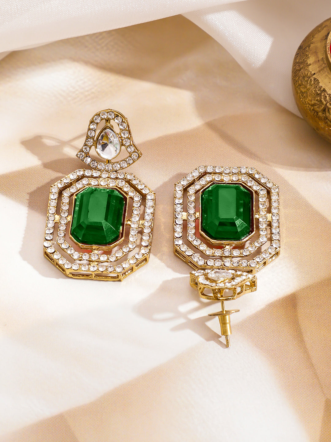 Necklace Set : This 22K gold-plated brass necklace set features emerald green stones with white Kundan and Cubic Zirconia detailing in a handcrafted multi-layer design for wedding and festive elegance.