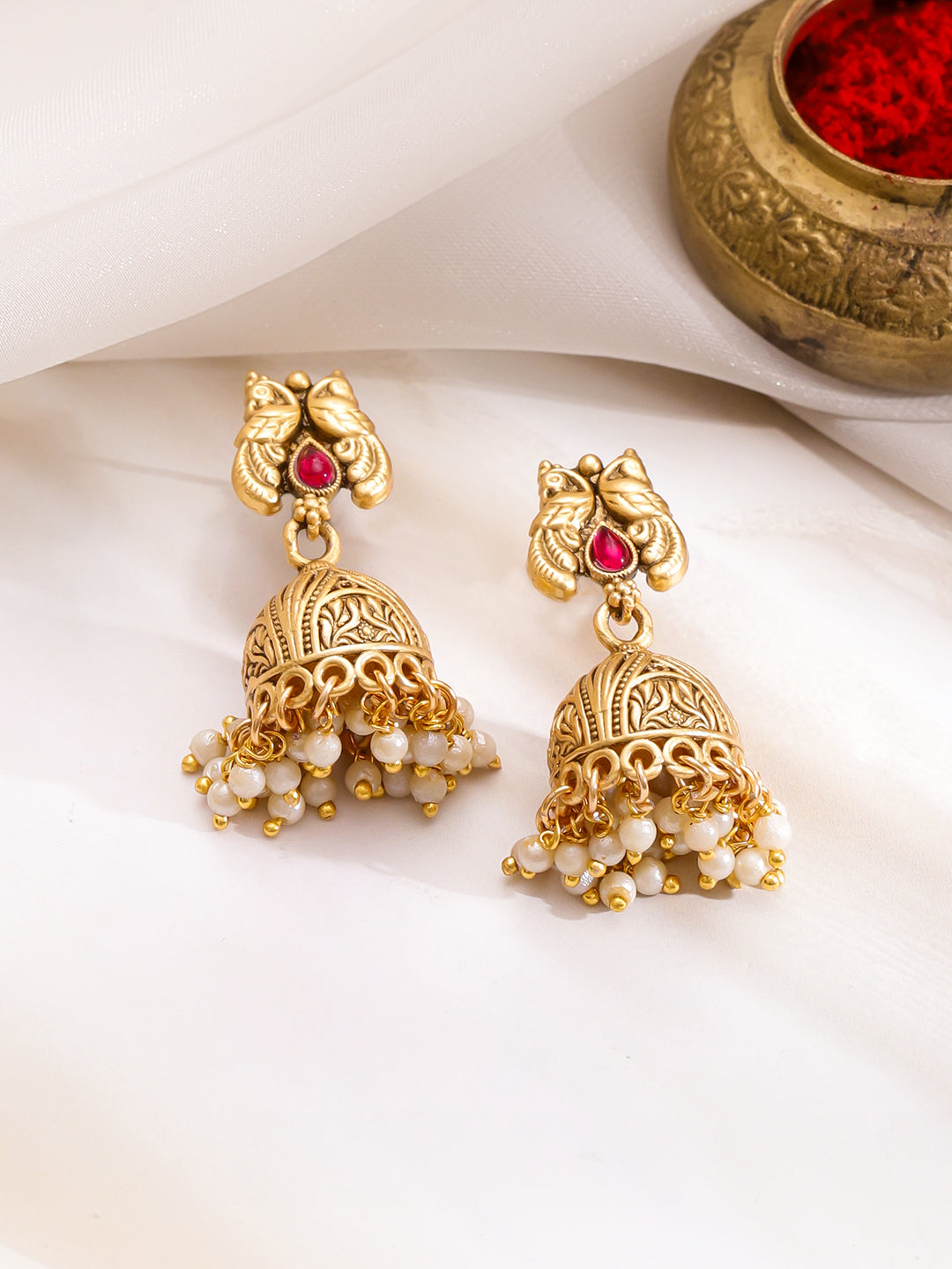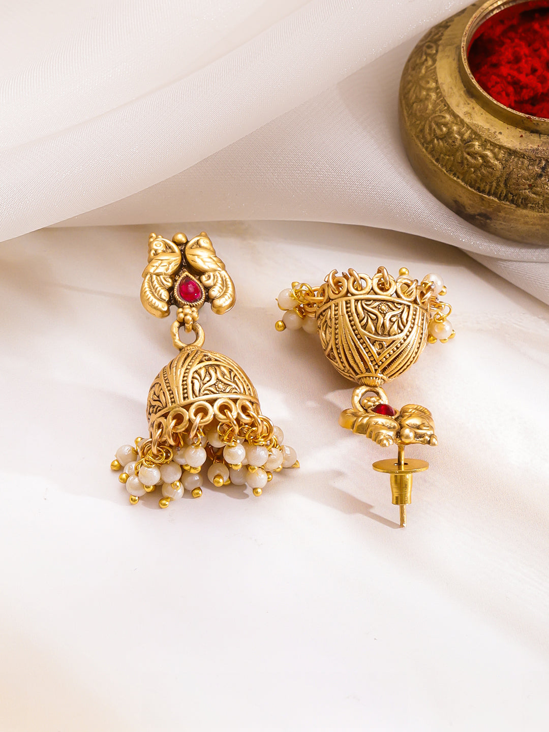 Necklace Set : Rubans 22K gold-plated brass traditional necklace set with leaf motifs, green beads, pearls and ruby red stone accent. Includes matching jhumkas, perfect for weddings, festive and party occasions.