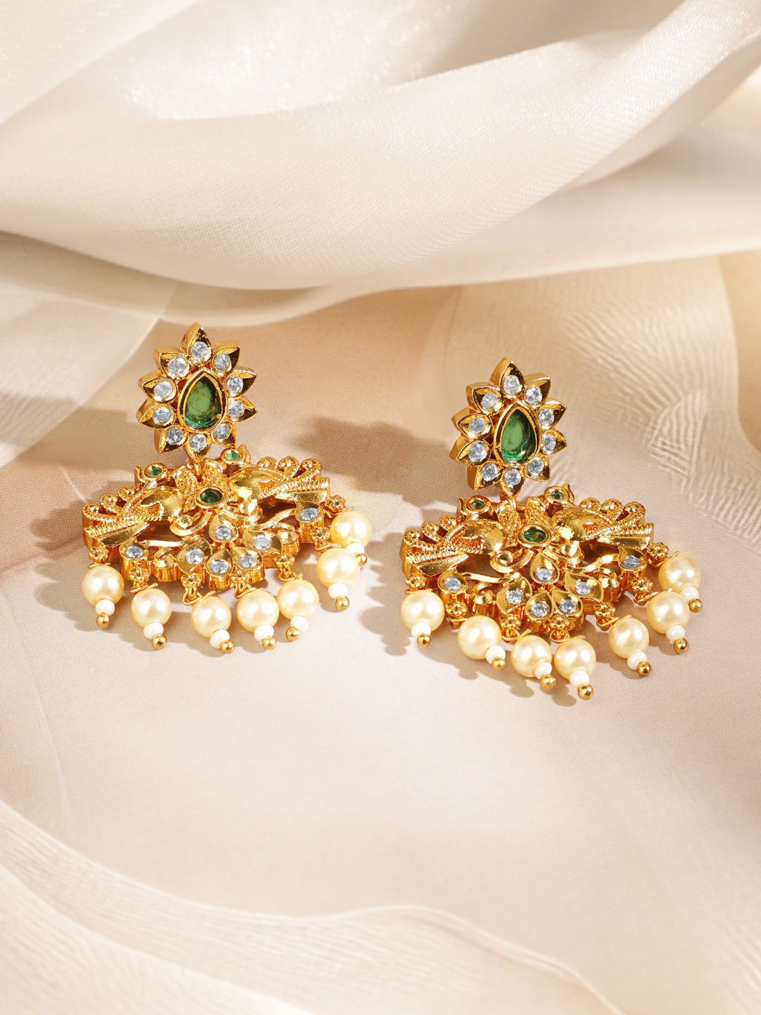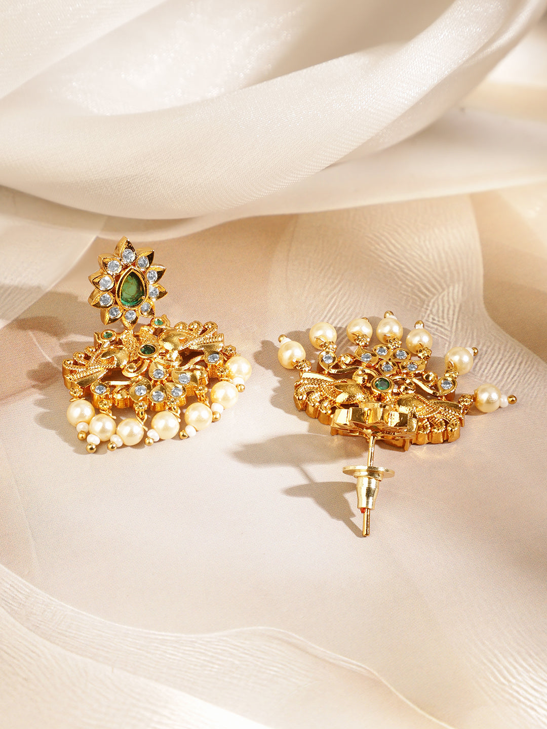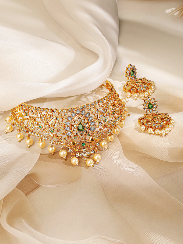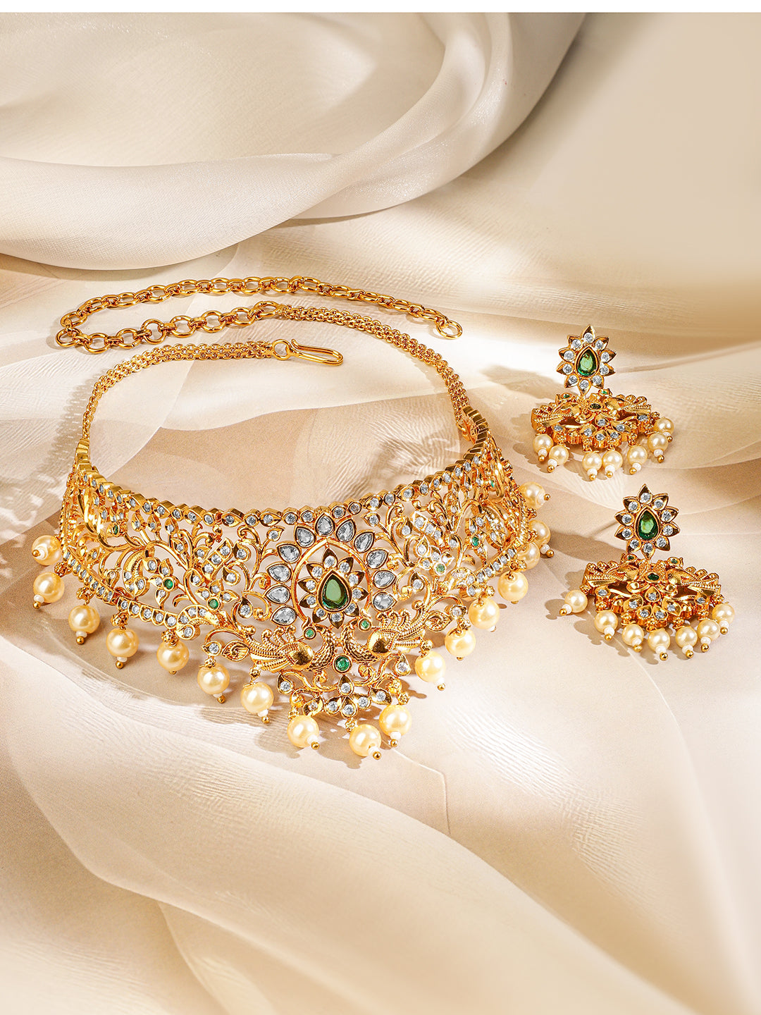 Necklace Set : This 22K gold-plated handcrafted choker set features an intricate floral motif with emerald green and white cz stones, adorned with classic pearl beads – ideal for bridal and festive occasions.