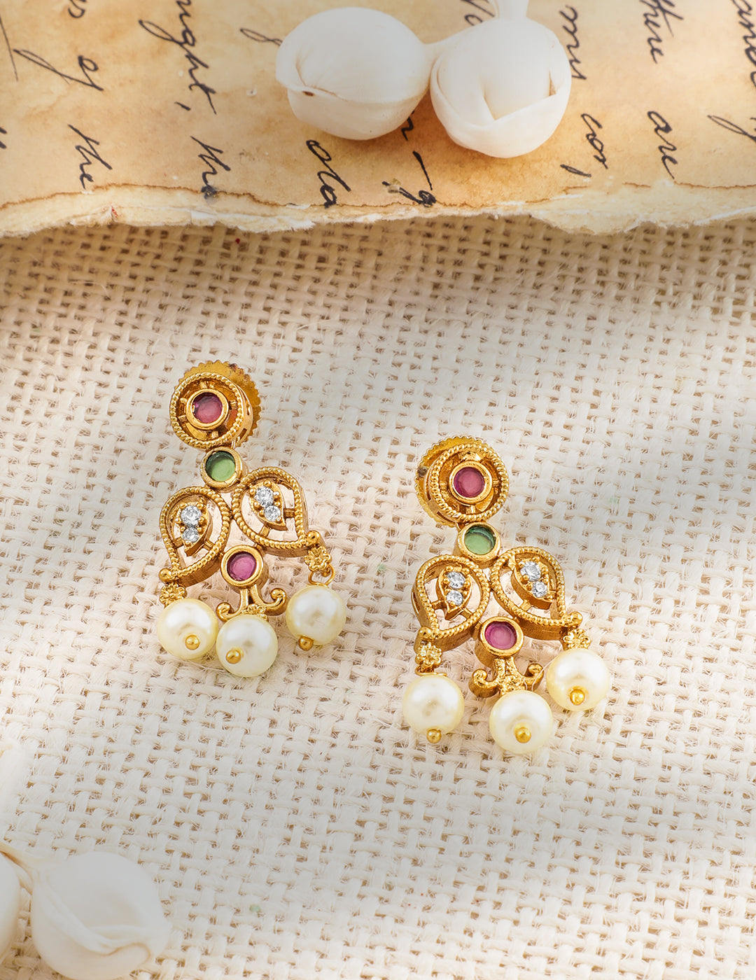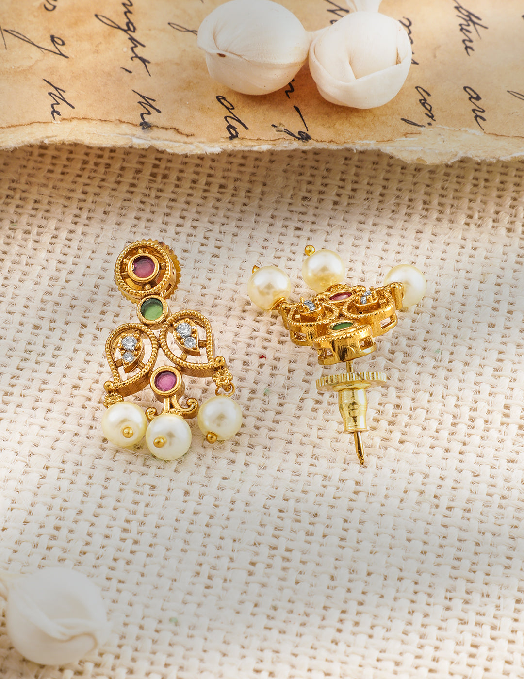 Necklace Set : This 22K gold-plated necklace set features ruby, emerald, and cubic zirconia stones. The intricate design is complemented by pearl drops, making it an ideal choice for traditional and festive wear.