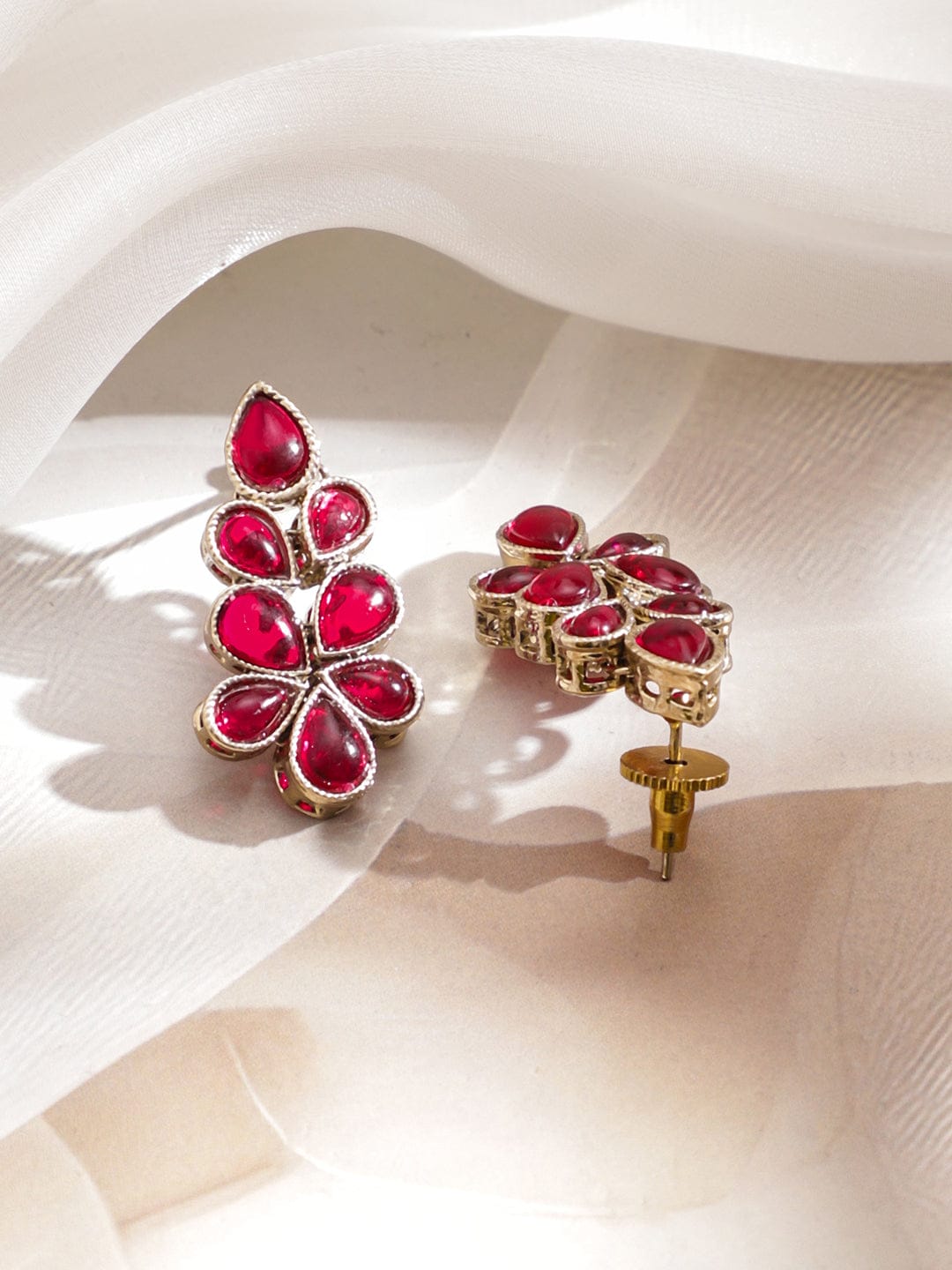 Jewellery Set: A luxurious 22K gold-plated necklace set by Rubans, studded with ruby pink kundan stones in a clustered floral design, paired with matching earrings, perfect for wedding, festive & party occasions.