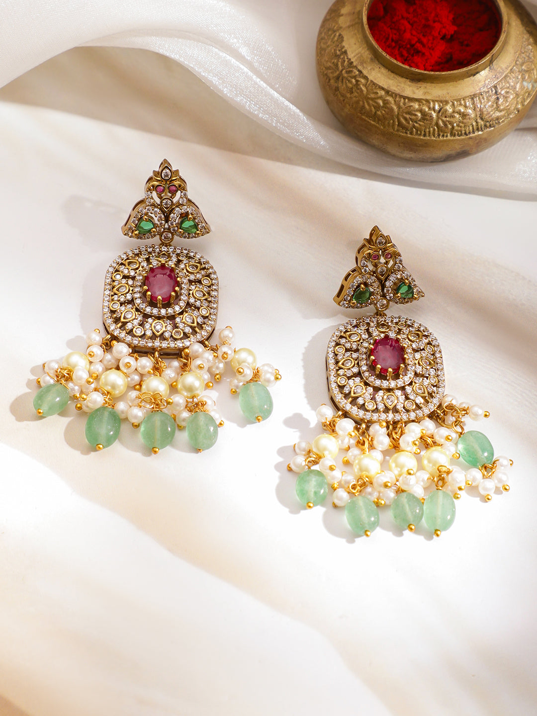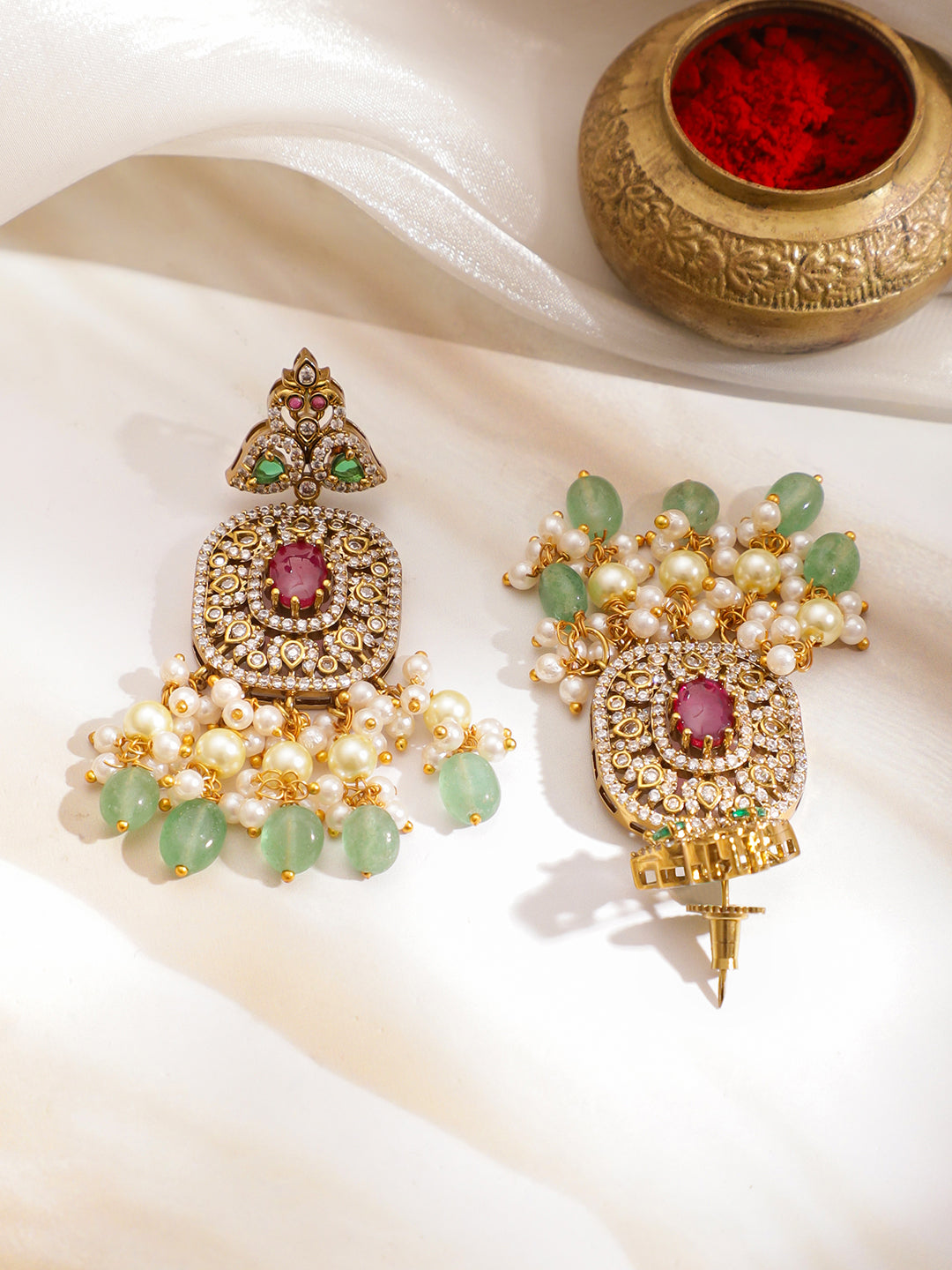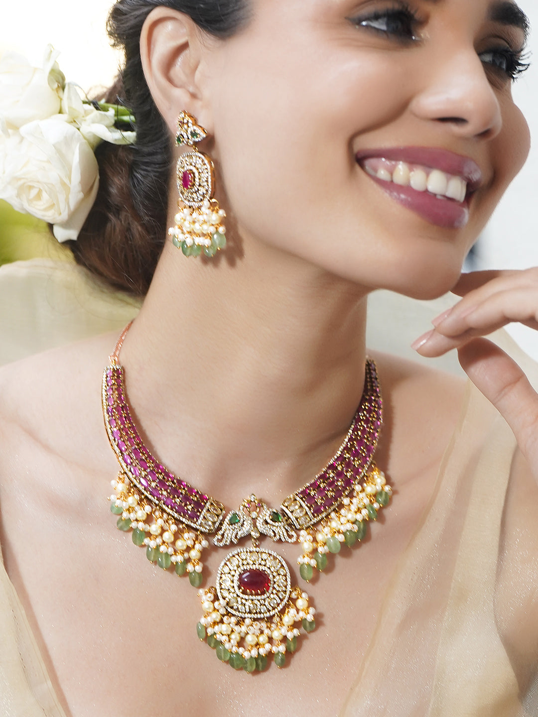 Necklace Set : A royal 24K gold-plated necklace set adorned with ruby red, emerald green & white kundan stones, featuring handcrafted gold motifs and multi-strand white and green beaded detailing for a majestic bridal look.