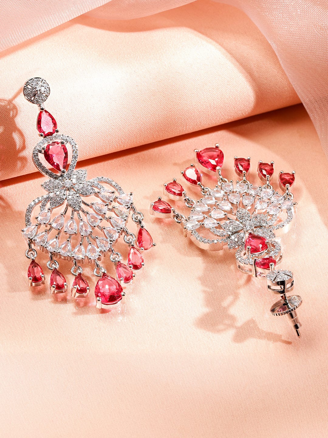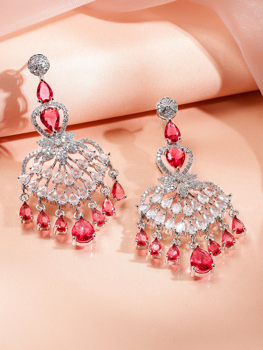 Rubans Rhodium-Plated Multi-Layer Ruby Red & Cubic Zirconia Chandelier Luxe Statement Necklace Set Jewellery Set