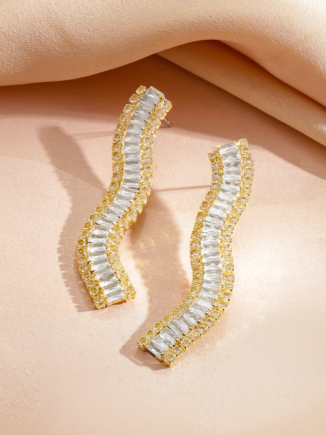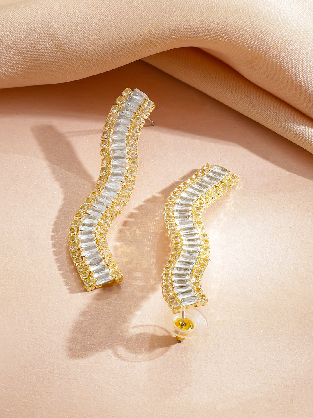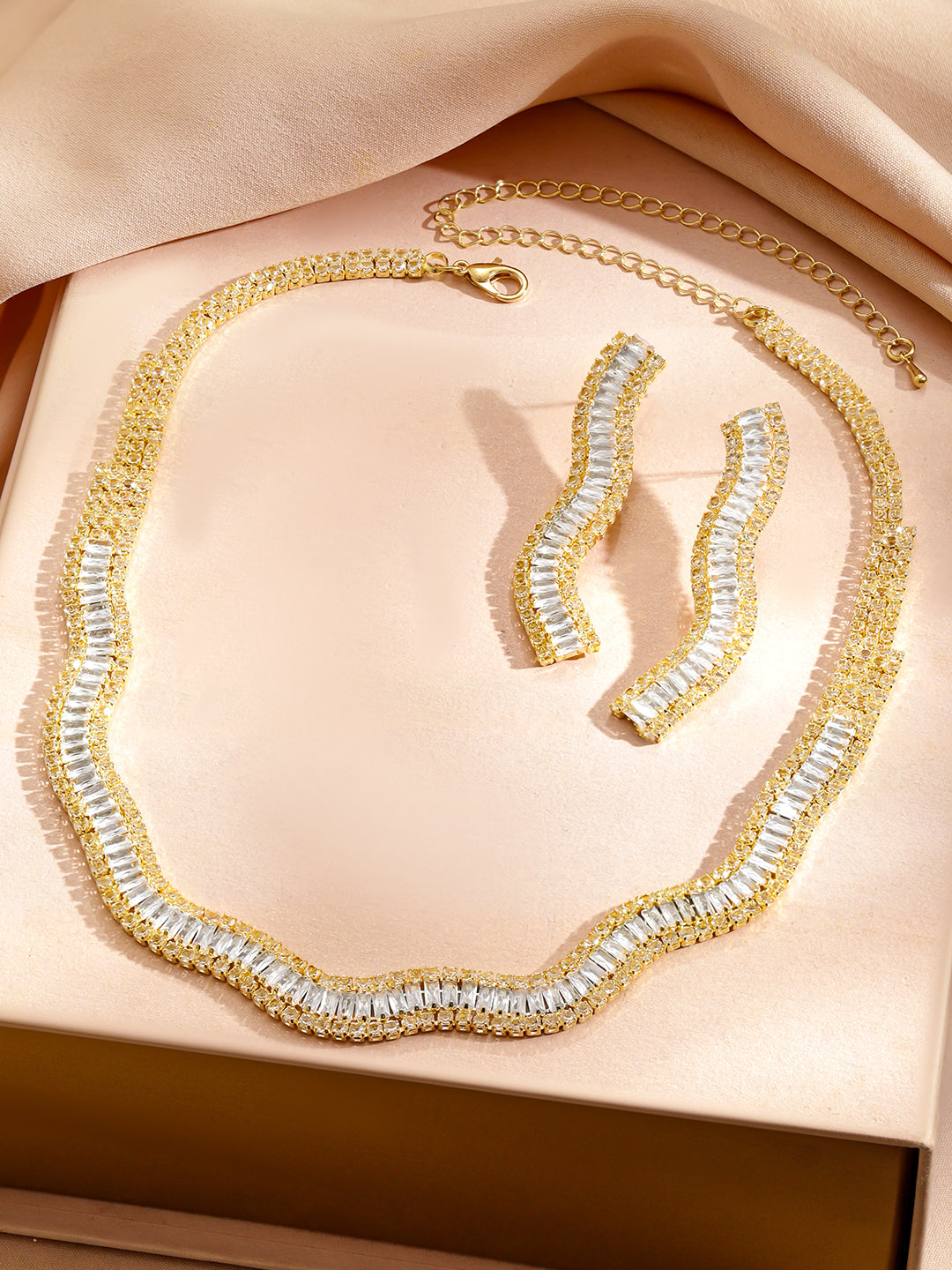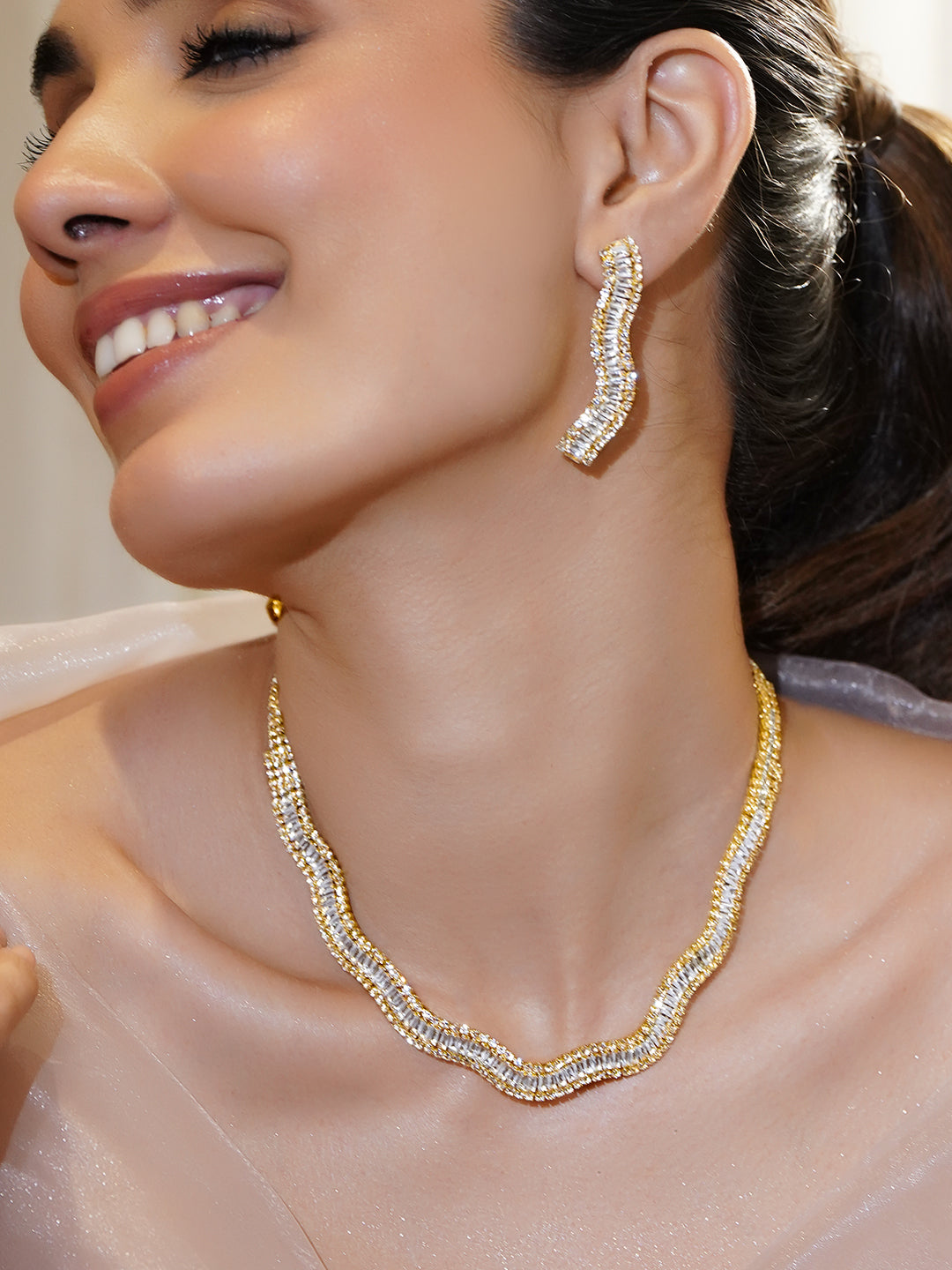 This Rubans Voguish 18K gold-plated brass necklace set with crystal AD stones in a wavy design brings a touch of modern luxury and radiant sparkle to festive and evening looks.